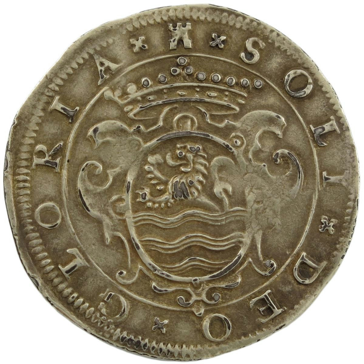 The defeat of the Spanish Armada, Dutch silver jeton, 1588, struck in Middelbourg, arms of Zeeland, crowned and garnished, SOLI DEO GLORIA, rev., two ships in action firing cannon and muskets, VENIT IVIT FVIT - CLASSIS HISP, 33mm (MI 146/113; Eim. 58; vL I, 384, 2; Dugn. 3186; MH 6). Some flatness in striking, a mark between ships where old gilding scratched away, very fine and rare.