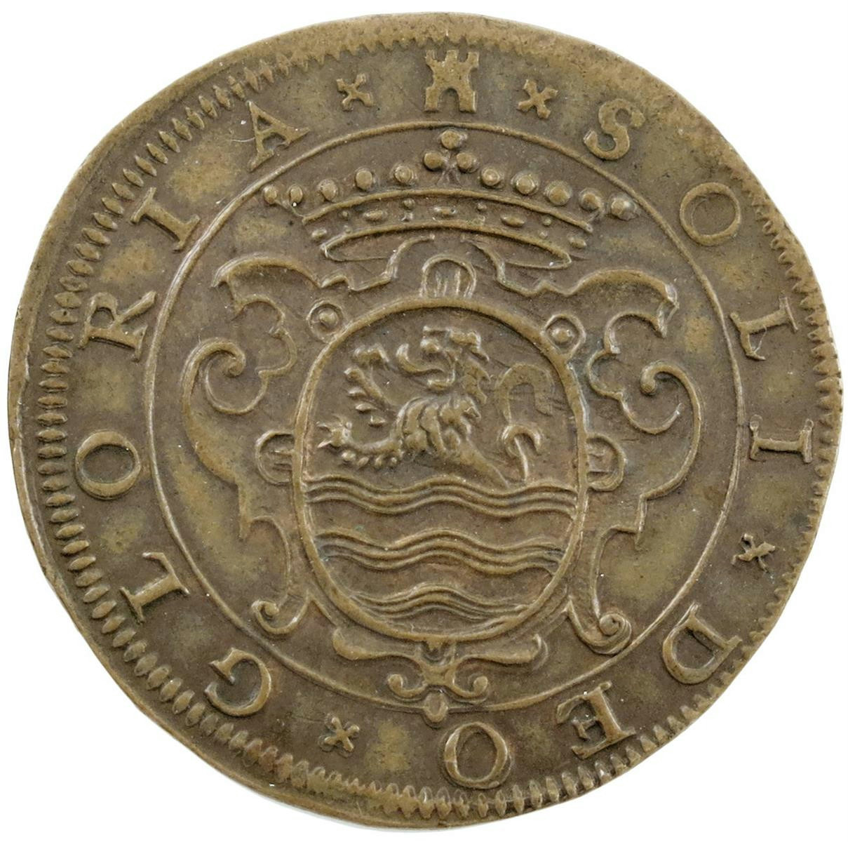 The defeat of the Spanish Armada, Dutch copper jeton, 1588, struck in Middelbourg, arms of Zeeland, crowned and garnished, SOLI DEO GLORIA, rev., two ships in action firing cannon and muskets, VENIT IVIT FVIT, 33mm (MI 146/113; Eim. 58; vL I, 384, 2; Dugn. 3186; MH 6). A lovely example on a full flan, extremely fine.