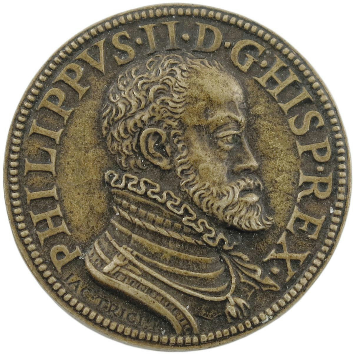Phillip II of Spain, the Spanish conquest of America [c. 1588], by Jacopo Nizolla da Trezzo, signed Jac Trici F, bust of Philip II right, PHILIPPVS II DG HISP REX, rev., two hands release globe from bands, SIC ERAT IN FATIS, 30.5 mm. (MI 148/118, see footnote; Attwood 95; Pollard, Bargello III, 726; vL I, 387/2; Toderi-Vannel 113; Börner 775; Cuesta 106, 2). A sharp early cast of superb quality, extremely fine and rare.