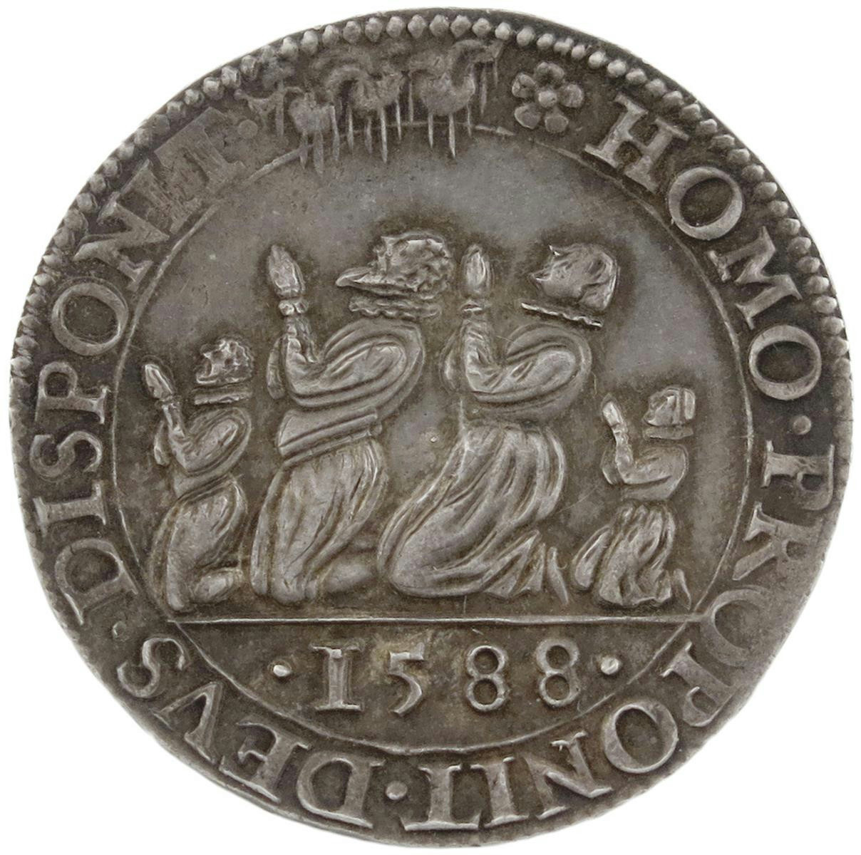 Elizabeth I, the defeat of the Spanish Armada, Dutch silver jeton, struck at Dordrecht, 1588, a family of four at prayer, HOMO PROPONIT DEVS DISPONIT, rev., a Spanish galleon breaking up against rocks, HISPANI FVGIV'T ET PEREV'T NEMINE SEQVETE, 29mm (MI 147/116; Eim. 60; vL I, 386; Dugn. 3188). Extremely fine with even tone, rare.