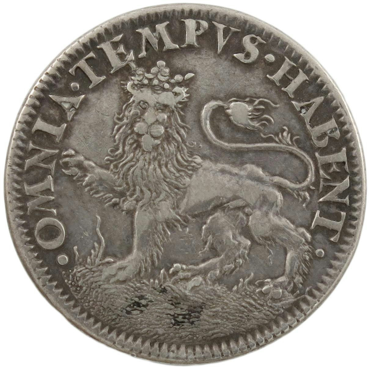 Ambrose Dudley (c. 1528/30-1590), Third Earl of Warwick, silver counter, 1588, a bear muzzled and chained stands by tree stump, OMNIA TEMPVS HABENT, rev., a crowned lion passant, OMNIA TEMPVS HABENT, 25.5mm (MI 151/125). Good very fine and extremely rare.