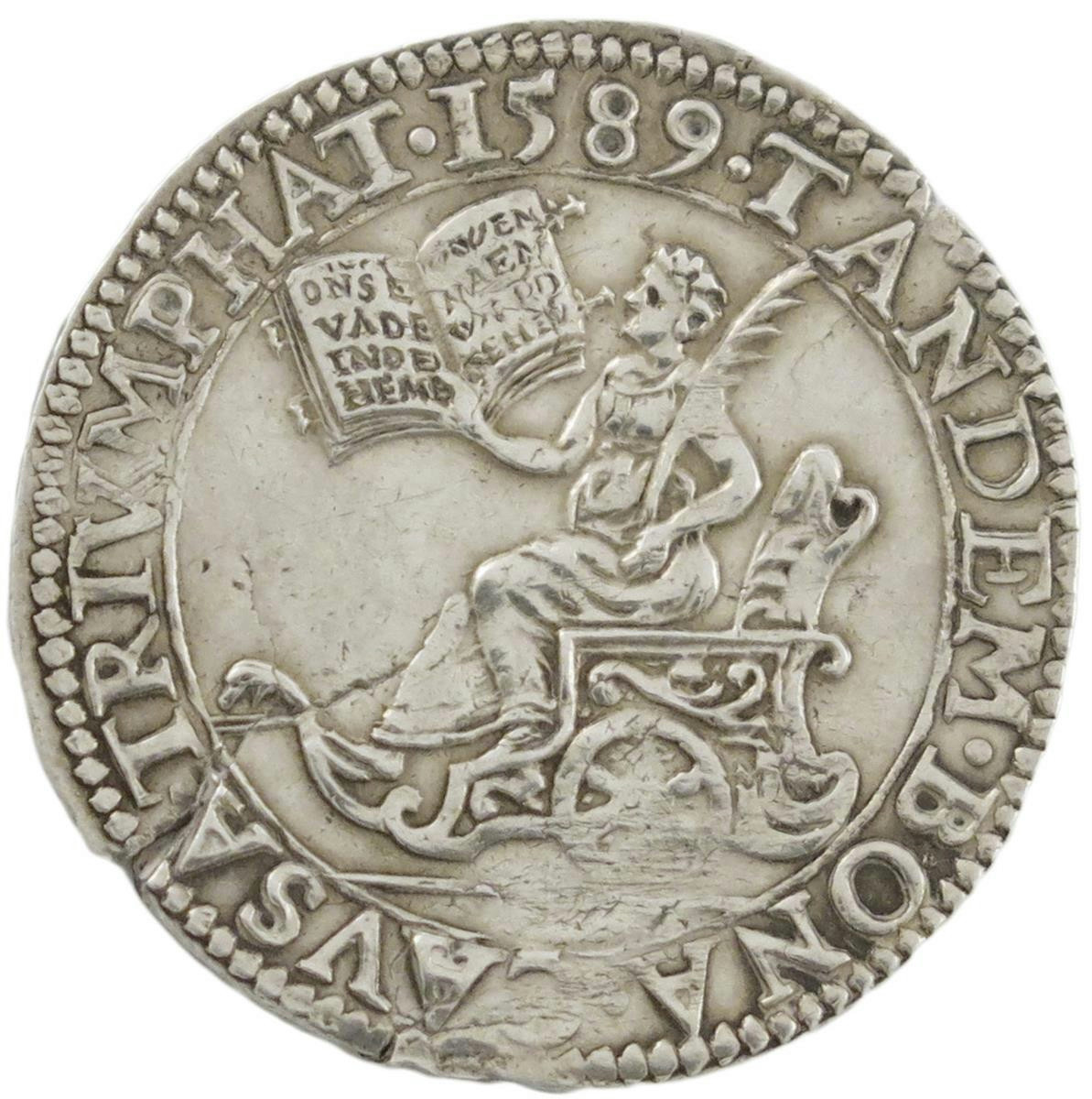 Elizabeth I, the defeat of the Spanish Armada and public thanksgiving, Dutch silver jeton, struck at Dordrecht, 1589, Elizabeth seated in car holds palm branch and open prayer book, TANDEM BONA CAVSA TRIVMPHAT, rev., a tree with young birds in a nest defending themselves from a bird of prey, SI NON VIRIBVS AT CAVSA POTIORES, 30mm (MI 153/128; Eim. 63; vL I, 388; Dugn 3230; MH 16). Has been buffed, but good very fine and rare in silver.