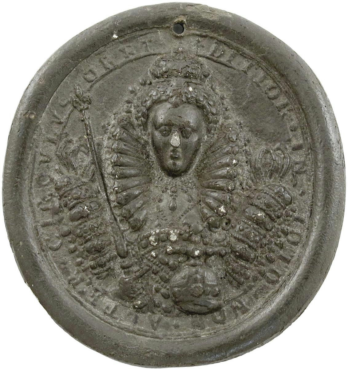 Elizabeth I, the Dangers Averted, uniface lead or pewter cast impression of the obverse, 1589, by Nicholas Hilliard (c.1547-1619), facing crowned bust in elaborate dress and high ruff collar, holding sceptre and orb, DITIOR IN TOTO NON ALTER CIRCVLVS ORBE, wide raised border, 66 x 62.5mm, believed to be 18th Century (MI 154/130; cf Eim. 62; MH 19; Scher [1994] 164;). Small piercing at top, cast with hollowed reverse, very fine.