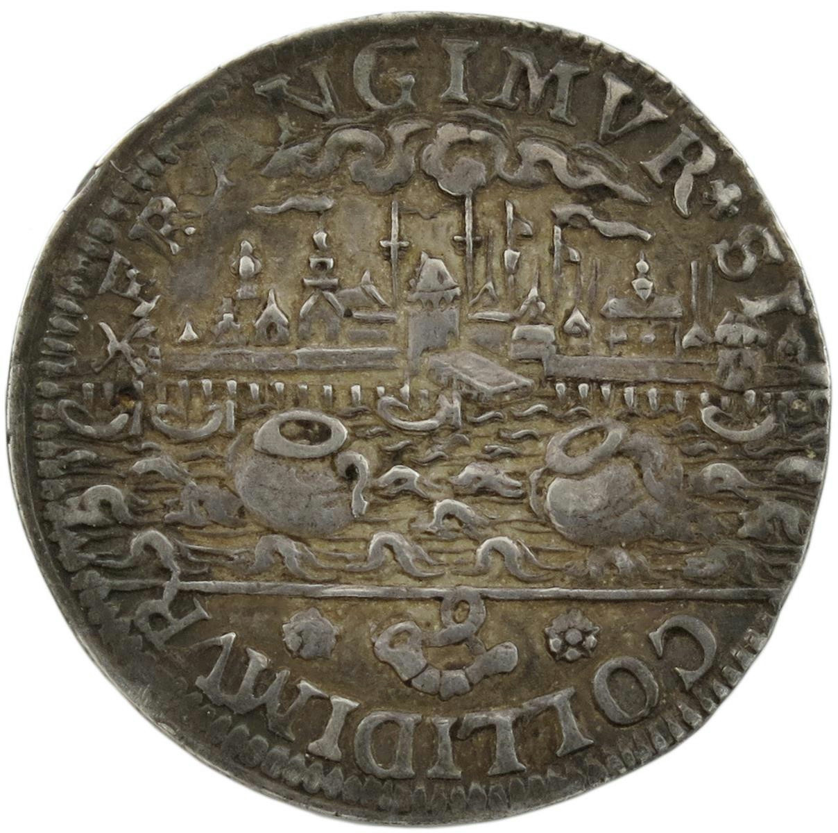 The city of Hoorn urges other cities to reach an agreement, Dutch silver jeton, 1591, a city view with river to the fore, on which floats two pots, FRANGIMUR SI- COLLIDIMVR, rev., two bullocks pull a plough, TRAHITE ÆQVO IVGO, 29mm (MI - ; vL I, 410; Dugn, 3272). Good very fine, toned and rare.