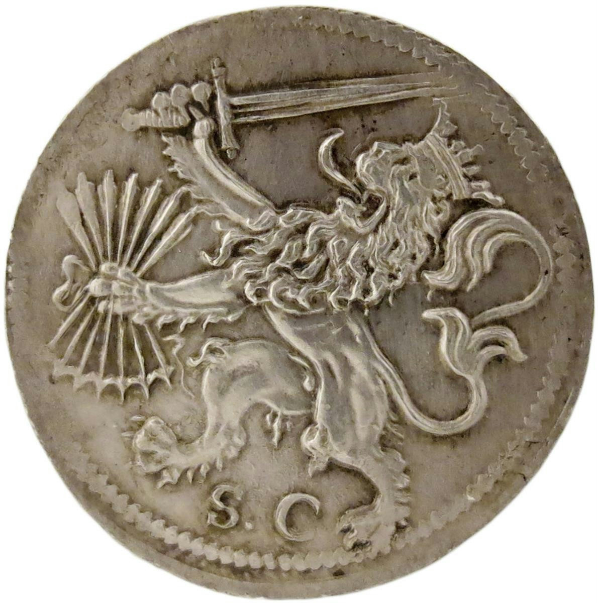 The alliance between England, France and the United Provinces, Dutch silver jeton, 1596, struck in Dordrecht, Belgic Lion to left, with sword and arrows, SC below, rev., hand from clouds holds three linked tassels, RVMPITVR HAVD FACILE, 30mm, (MI 160/141; vL I, 471; Dugn 3398). Nearly extremely fine but at sometime cleaned.