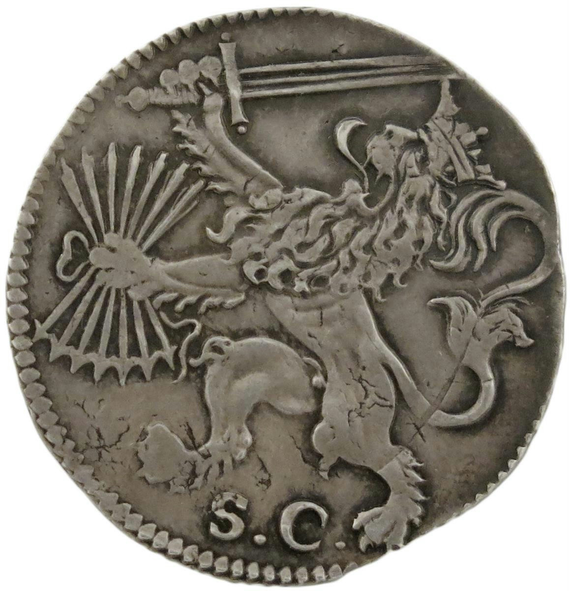 The alliance between England, France and the United Provinces, Dutch copper jeton, 1596, struck in Dordrecht, Belgic Lion to left, with sword and arrows, SC below, rev., hand from clouds holds three linked tassels, RVMPITVR HAVD FACILE MDXCVI, 28mm, (MI 160/141; vL I, 471; Dugn 3398). Good very fine.