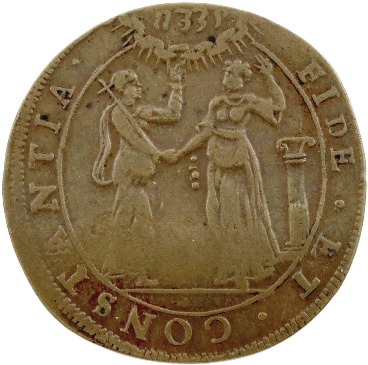 The alliance between England, France and the United Provinces, copper jeton, 1596, Faith and Constancy join hands appealing to the name יְהֹוָה above, FIDE ET CONSTANTIA, rev., a hand from heaven smites a sow with a stone, CÆSA FIRMABANT FOEDERA PORCA, 28mm (MI 161/143; Dugn. 3401). Almost very fine.