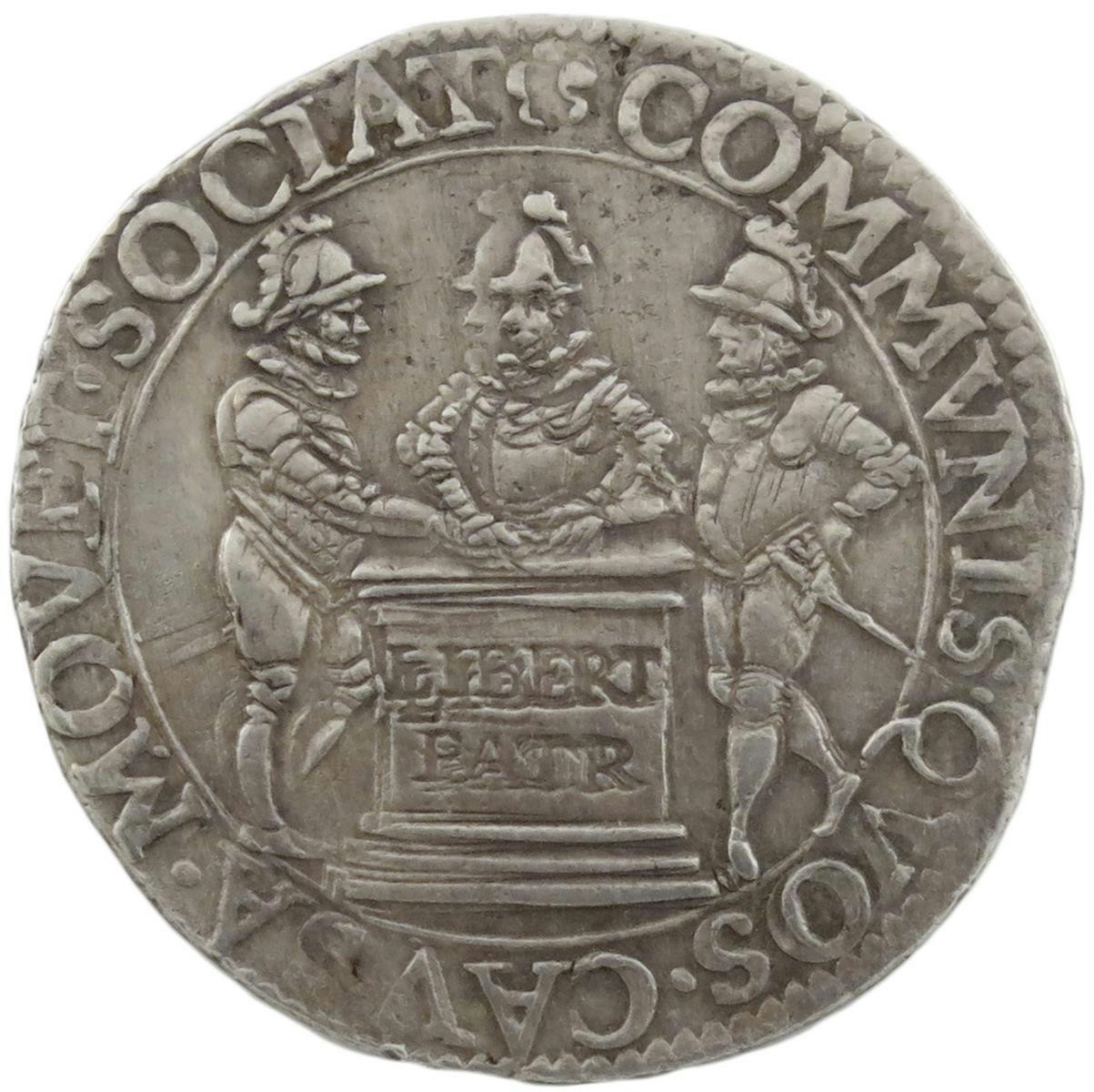 The Need for vigilance with the Truce and the Triple Alliance between England, France and the United Provinces, Dutch silver jeton, Dordrecht, 1596, three soldiers join hands on altar, COMMVNIS QVOS CAVSA MOVET SOCIAT, rev., soldier points sword at tablet suspended from column, TITVLVS FOEDERIS, 30mm (MI 161/144; Dugn 3402; vL I, 471; Pax 37 var). Very fine.