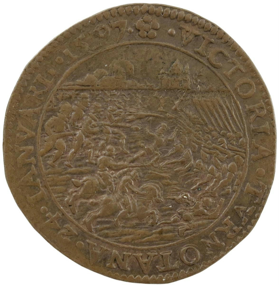 The Battle of Turnhout, Dutch copper jeton, struck in Dordrecht, 1597, Spanish troops flee before those of Prince Maurice, VICTORIA TVRNOTANA, rev., shields of England France and United Provinces united with a cord, A DOMINO FACTVM EST ISTVD, 29mm (MI 165/151; Dugn 3412; vL I, 479). Good very fine.