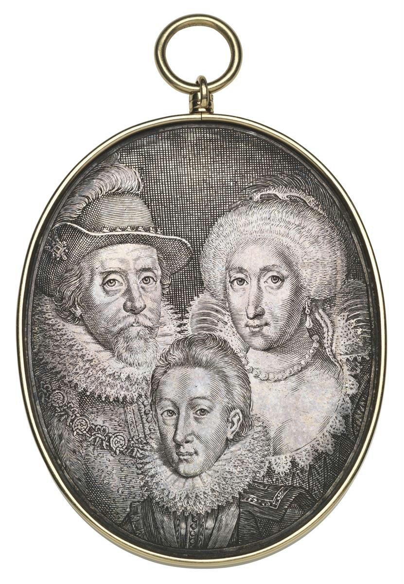 James I, Queen Anne, and Prince Charles, oval silver portrait medal, by Simon de Passe, unsigned, circa 1616, in imitation of engraving, busts of the King, in large plumed hat, ruff collar and Collar of office, Queen Anne with pearl earring and necklace and high lace ruff collar, the Prince with ruff collar and medal ribband, rev., shields of the King and Queen supported by lion and wildman with, above, helm and crest, the Prince's Plumes in oval shield below, mottoes on scrolls, POTENTISS IACOBVS DG MAG BRITT ET HIB REX ET SERENISS ANNA DG MAG BRITT REGINA VNA CVM ILL P CAROLI M BRIT PRINCIpis, 65 x 53 mm, including mount but not suspender (MI 217/68), set in a later gold display mount with swivelling suspension loop. Extremely fine, toned and very rare.