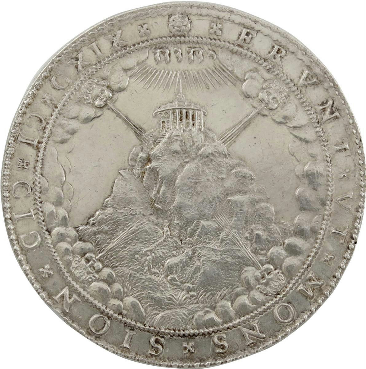 The Synod of Dort [Dordtrecht], silver medal, 1619, by W. van Bijlaer, a variety, panoramic view of the long chamber at Dordrecht with the Council assembled, date only on barrier, ASSERTA RELIGIONE, rev., pilgrims ascend a hill, on which the temple of heaven is attacked by the four winds, the name יְהֹוָה radiates from above, ERVNT VT MONS SION, 58mm (MI 223/78; vL II, 105; Eim. 99). Choice extremely fine.