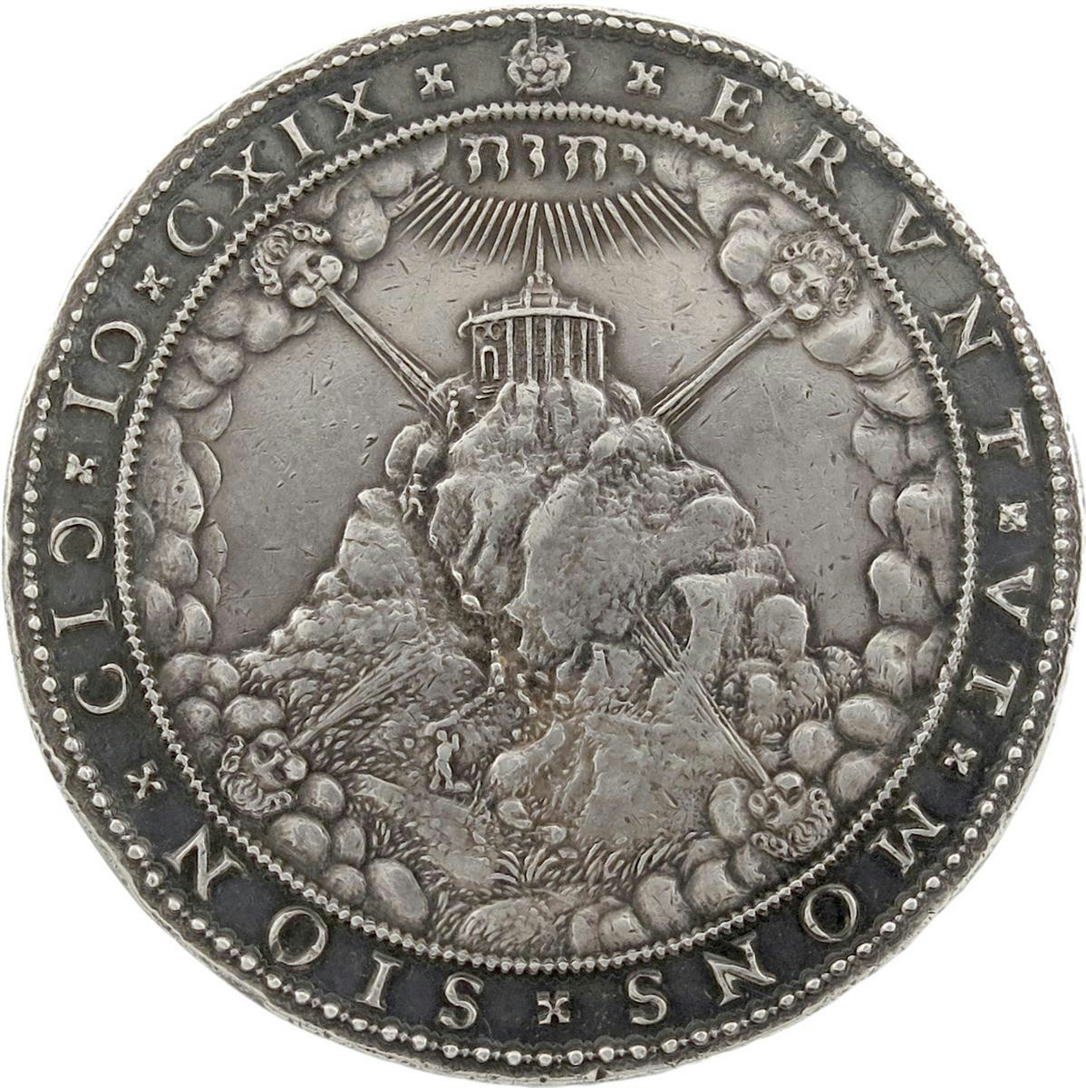 The Synod of Dort [Dordtrecht], silver medal, 1619, by W. van Bijlaer, similar variety, panoramic view of the long chamber at Dordrecht with the Council assembled, date only on barrier, ASSERTA RELIGIONE, rev., pilgrims ascend a hill, on which the temple of heaven is attacked by the four winds, the name יְהֹוָה radiates from above, ERVNT VT MONS SION, 58mm (MI 223/78; vL II, 105; Eim. 99). Almost extremely fine, toned.