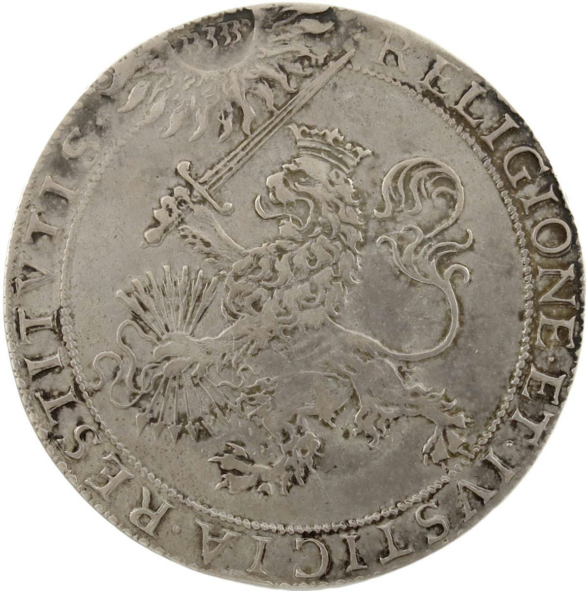 crowned Belgic Lion to left with arrows and sword, the name יְהֹוָה radiates from above, RELIGIONE ET IVSTICIA RESTITVTIS, rev., crowned shield of the arms of Prince Maurice, within Garter, two clasped hands below, RESPVBLICA DEMVM FLOREBIT, 58mm, 57.49g (MI 223/79; vL II, 113; Eim. 100). Very fine.