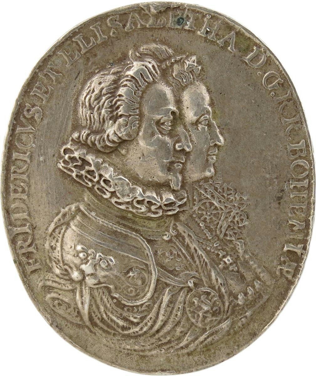 Frederick V (1596-1632) and Elizabeth Stuart (1596-1662) of Bohemia, Coronation as king of Bohemia, silver medal, 1619, by Christian Maler [Nürnberg], conjoined busts right, he in armour and with ruff collar, wearing Garter George, she withhigh lace collar, rev., central oval medallion, with five hands supporting crown, placed on legend, FRIDERI DG COM PALAT …, bundle of tied arrows below, 40 x 33.5mm (MI 225/82; Stemper 162; Don. 2034; Memmesheimer 2264). Very fine and rare.