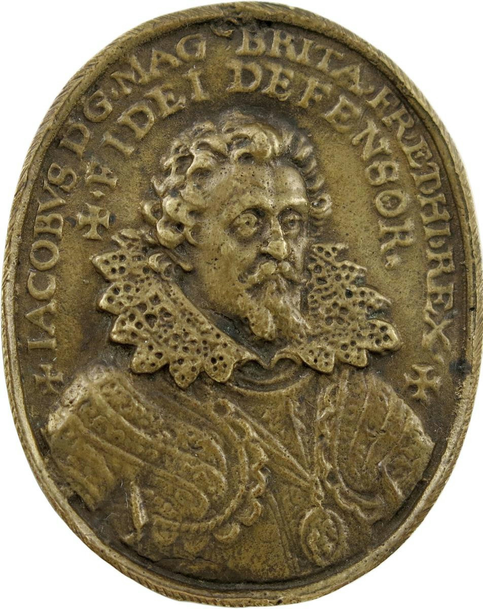 James I, Naval Reward, the 'Ark Badge', c. 1620, cast bronze medal, possibly by Nicholas Hilliard, half-length bust of James I three-quarters right, wearing decorated armour, elaborate high lace collar and Garter George on ribbon, + IACOBVS DG MAG BRITA FR ET HI REX + / + FIDEI DEFENSOR, rev., smoke rises from chimney on Noah's Ark as it drifts on a wavy sea, + STET SALVVS IN VNDIS, 54.5 x 43.5mm (MI 233/95; cf. Eim. 101A). An old cast from a specimen with two small piercings at the top, very fine and very rare.