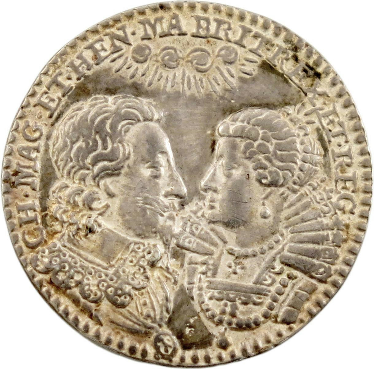Charles I, Marriage to Henrietta Maria (1609-1669), cast silver medallet, 1625, by Pierre Regnier, busts vis-à-vis, he wearing falling lace collar, CH MAG ET HEN MA BRIT REX ET REG, rev., cupid scattering roses and lilies, FVNDIT AMOR LILIA MIXTA ROSIS, 22.5mm (MI 238/1; Eim.105, BMC [Jones] 101-104; Platt I, type A, pp. 115-16). Very fine.