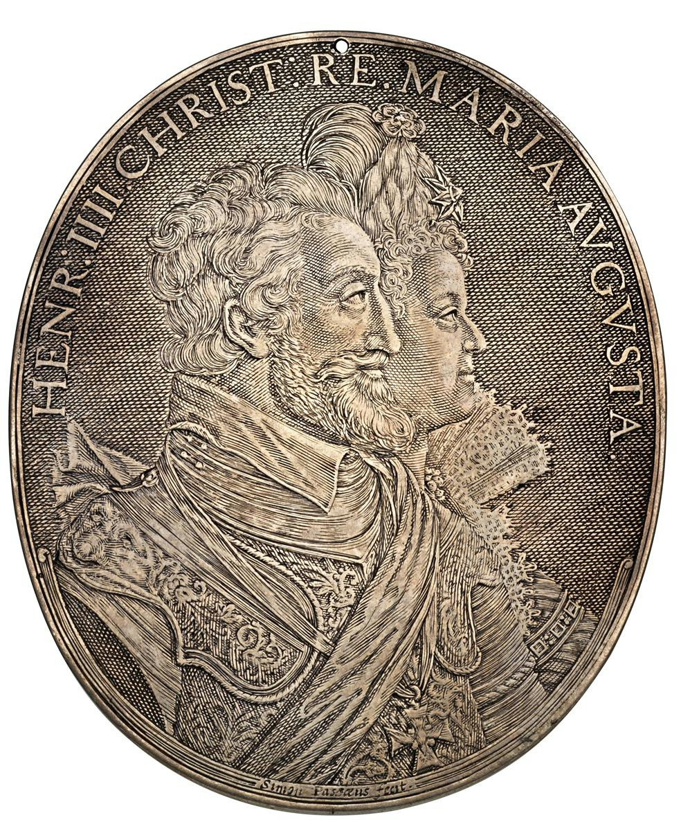 Henri IV (1553-1589-1610) and Marie de Médicis (1573-1642), King and Queen of France, oval silver portrait medal, by Simon de Passe, unsigned, circa 1625, in imitation of engraving, conjoined busts to right, he in decorated armour, a sash from his left shoulder and, on a ribbon, the Badge of the Order of the St. Esprit, she with decorative high lace collar and jewelled star in her hair, signed below, "Simon Passæus fecit", HENR IIII CHRIST RE MARIA AVGVSTA, rev., crowned oval with the shields of France and Navarre and crowned H and olive branches, within the Collars of the Orders of St. Michael and the St. Esprit, signed below, "Sim: Passæus sculpsit", 66 x 55mm (MI 240/7). A superb medal, extremely fine and extremely rare.