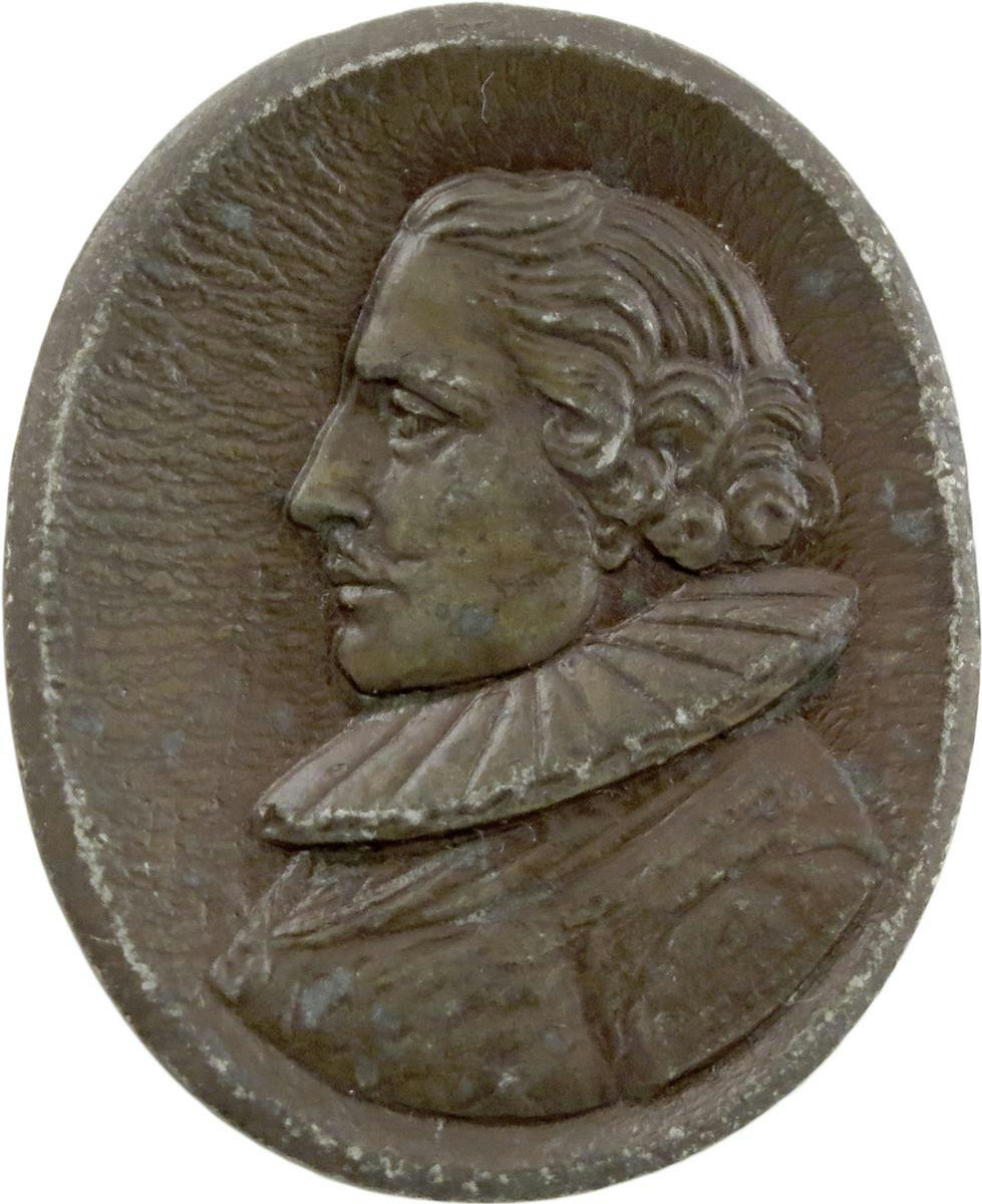 George Villiers, 1st Duke of Buckingham (1592-1628), uniface oval bronzed-lead medal, c. 1628, bust left wearing ruff collar and garter George on ribbon, on 'wavy' background, rev., engraved "G. VILLERS DVKE BVCKIN", 43 x 35mm (Hodgkin 13; MI - ; Platt - ). Very fine and rare.