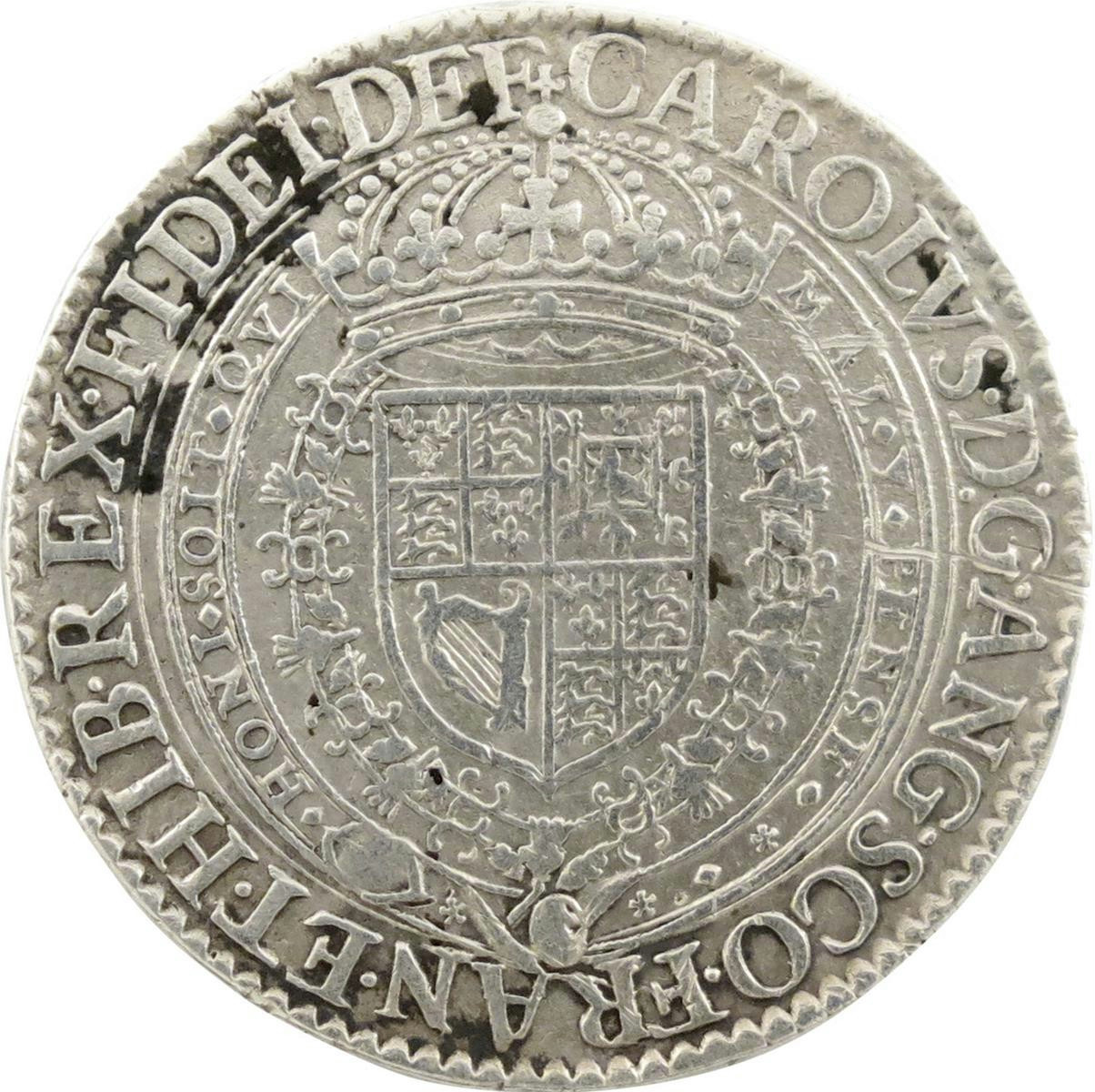 Charles I, Naval and Military Tribute, or "So-Called" Pattern Shilling, ilver medal, 1628, by Nicholas Briot, armorial shield within Collar of the Garter, crowned, CAROLVS DG ANG SCO FRAN ET HIB REX FIDEI DEF, rev., crossed sceptre and trident tied with a cord, REGIT VNVS VTROQVE, 1628, in exergue, 28mm (MI 250/27; Eim. 112; BMC [Jones] 132; Brooker 1260; North 2676; Platt, type B, pp. 120-21). About fine.