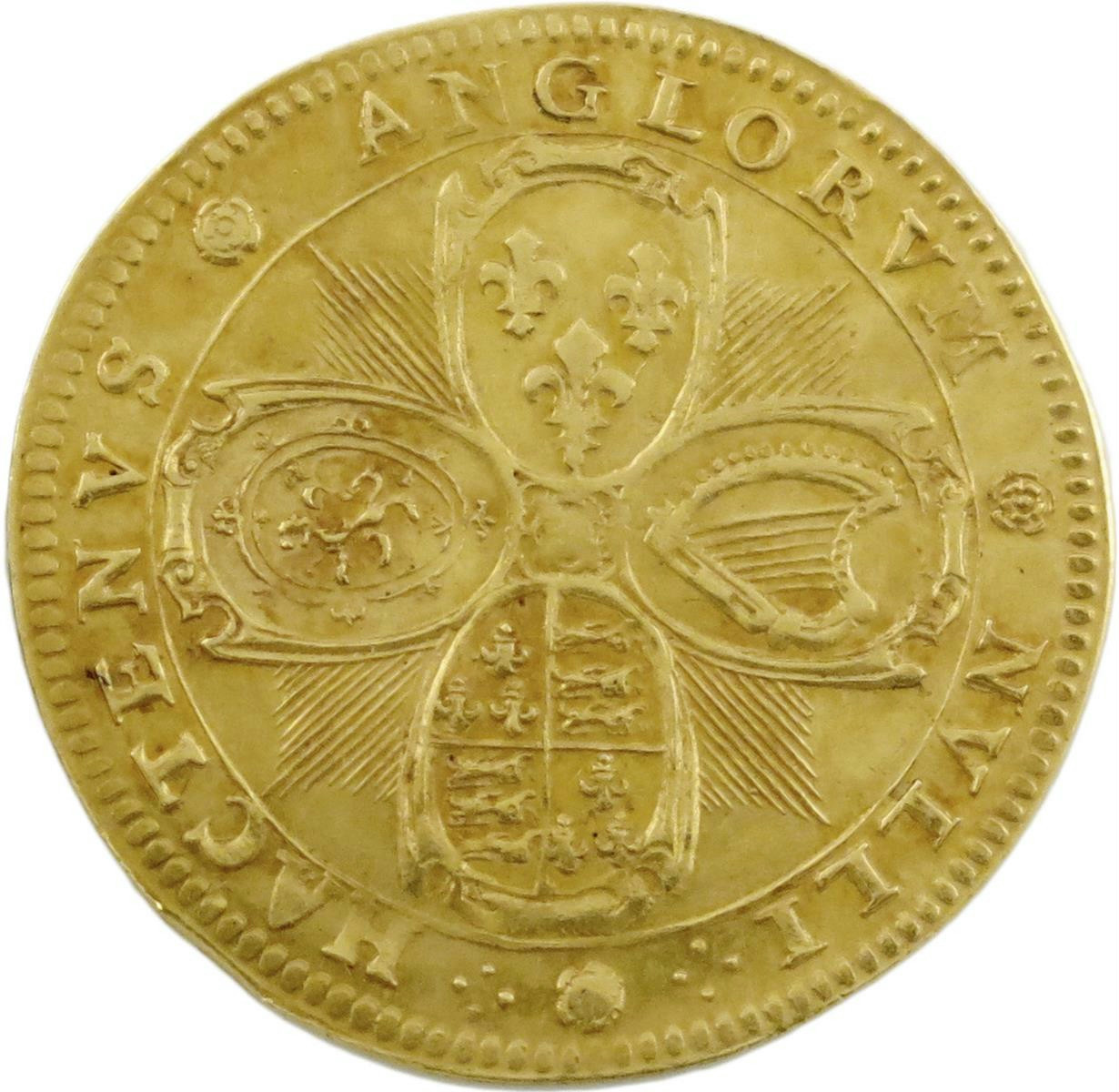 Charles I, birth of Prince Charles, gold medal, 1630, attributed to Nicolas Briot, cruciform arms of England and France, Scotland, France, and Ireland over radiant star, HACTENVS ANGLORVM NVLLI, rev., legend in five lines, within cartouche, HONOR PRIN MAG BRIT FRA ET HIB NAT 29 MAI ANN 1630, 30.5mm; 6.80g (MI 254/35; Eim. 116; Platt, type B, p. 128). Extremely fine, very rare in gold.