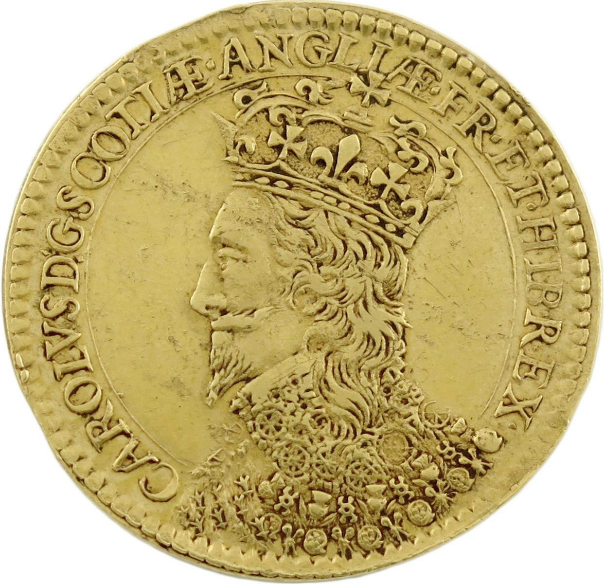 Charles I, the Scottish Coronation, gold medal, 1633, by Nicolas Briot, signed B on rev., crowned and draped bust left, wearing ornate lace collar, CAROLVS DG SCOTIÆ ANGLIÆ FR ET HIB REX, rev., a Scottish thistle in flower, HINC NOSTRÆ CREVERE ROSÆ, 30mm; 9.9g (MI 266/60; Eim. 123; BMC [Jones] 155; Platt p. 133, type B; Woll. iii). Good very fine and very rare in gold.