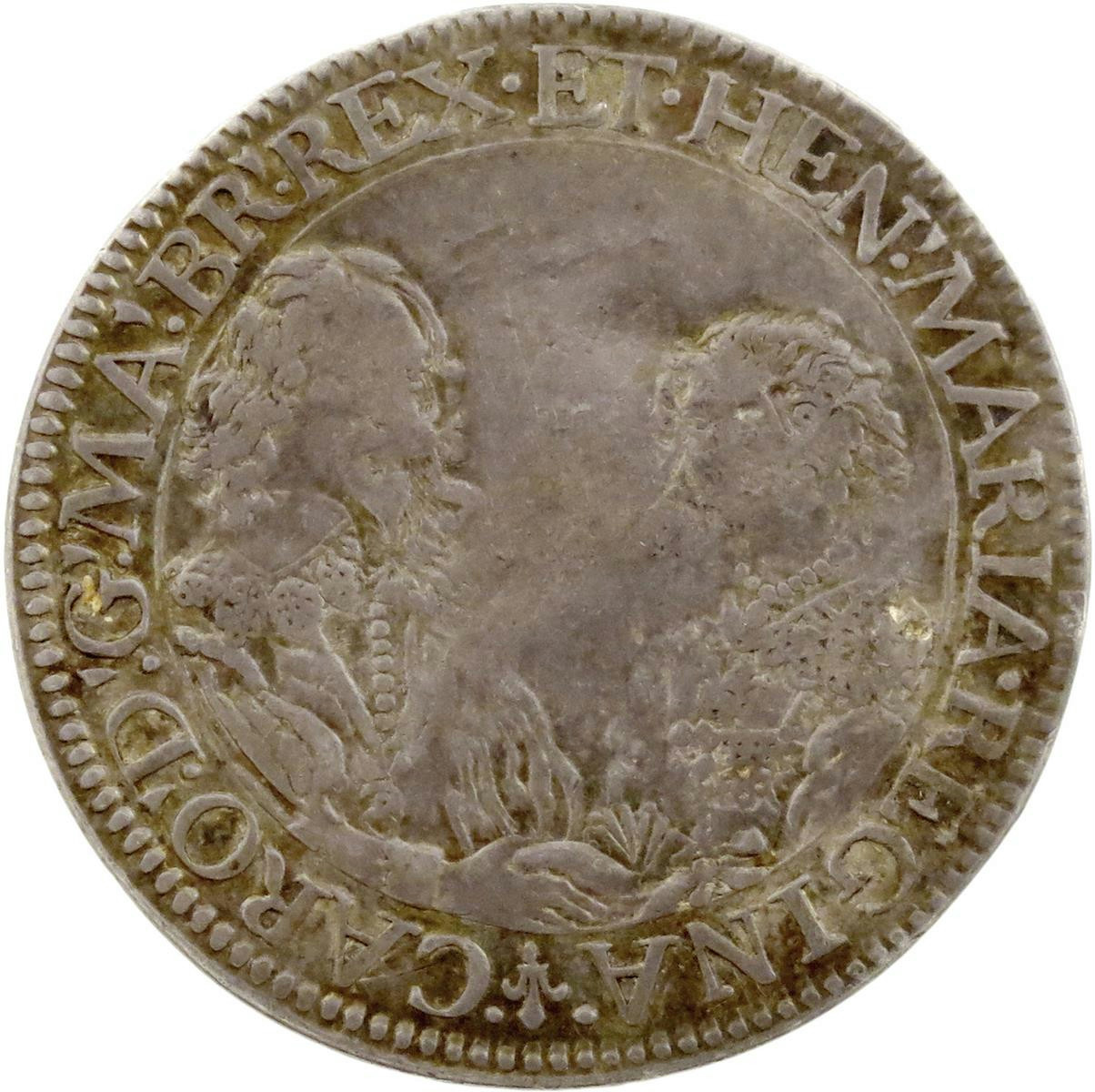 Charles I, the King's children, silver medal, 1635, by Nicolas Briot, busts of Charles I and Henrietta Maria vis-à-vis and holding hands, CAROL DG MA BR REX ET HEN MARIA REGINA, rev., the three children, Princes Charles and James and Princess Mary, wearing embroidered dresses and caps, cherubs above holding crown, REGIS REGNORVM POPVLIQVE SALVS, 31.5mm (MI 273/73; Eim. 127; BMC [Jones] 164; Platt, pp. 142-43; Farquhar I, 194; II, 236). Strictly fine but a very rare medal.