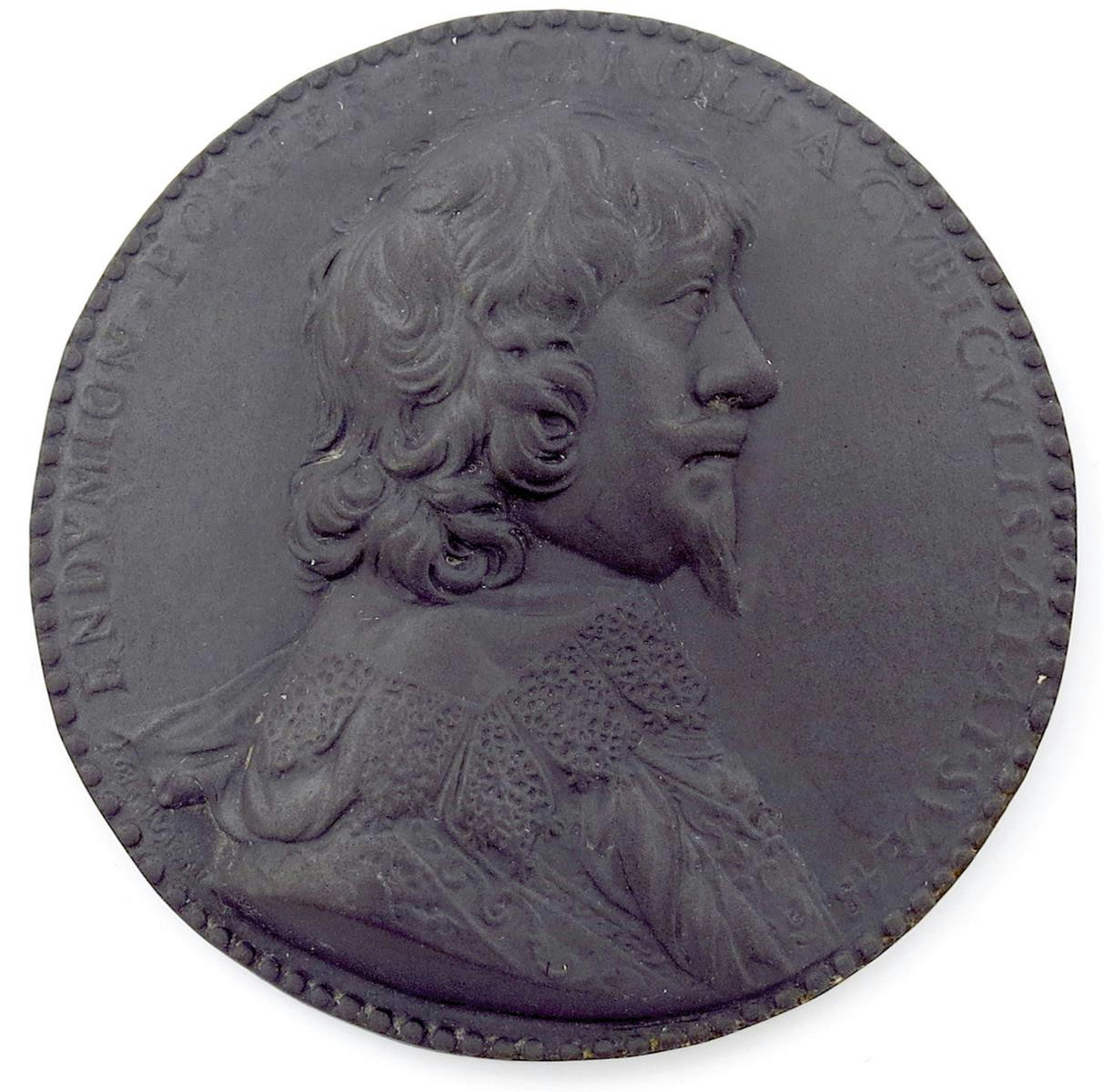 Endymion Porter (1587-1649), diplomat and royalist, black basalt medal, believed Wedgwood, after the bronze medal by Jean Warin (1635), his bearded bust right, wearing lace collar, ENDYMION PORTER R CAROLI A CVBICVLIS ÆTAT SVÆ 48, 71.5mm (cf MI 276/78; pl. XXIII, 3; cf BMC [Jones] 298; R & S, p. 282), late 18th century and without mark. As made.