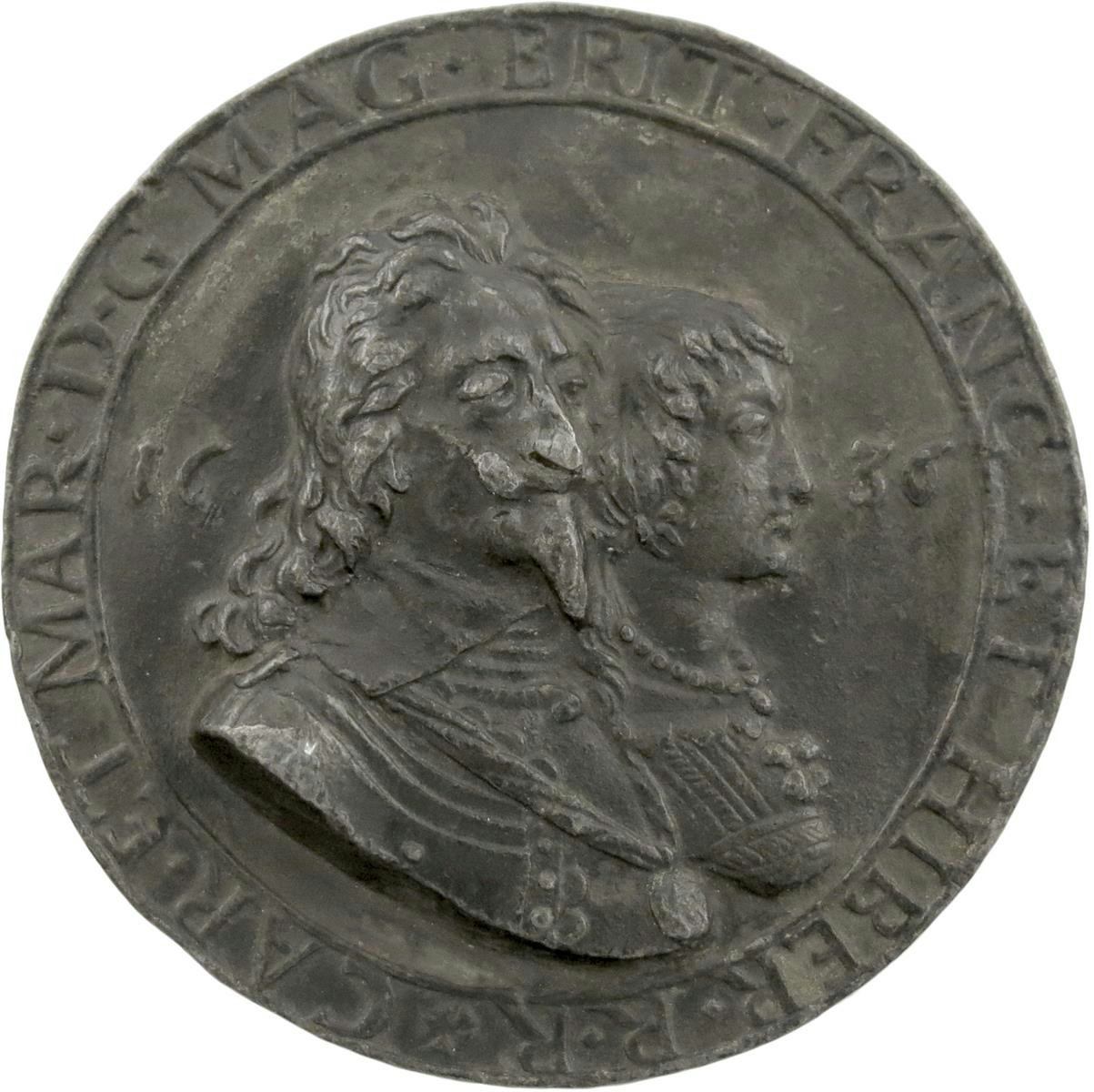 Charles I, the Anglo-Dutch Fishing Treaty, cast lead medal, 1636, by Hans Reinhardt, conjoined busts of Charles I and Henrietta Maria right, dividing date 16 - 36, he in armour wearing wide lace collar and Garter George on ribbon, she with pearl necklace, CAR ET MAR DG ANGL FRANC ET HIBER RR, rev., seated figures of Justice and Peace, embracing, two infant genii in attendance, IVSTITIA ET PAX OSCVLATÆ SVNT PSAL 84, 55mm (MI 278/82; Eim. 128). The variety with a stop point between the two R's at end of obverse legend, good fine, rare.