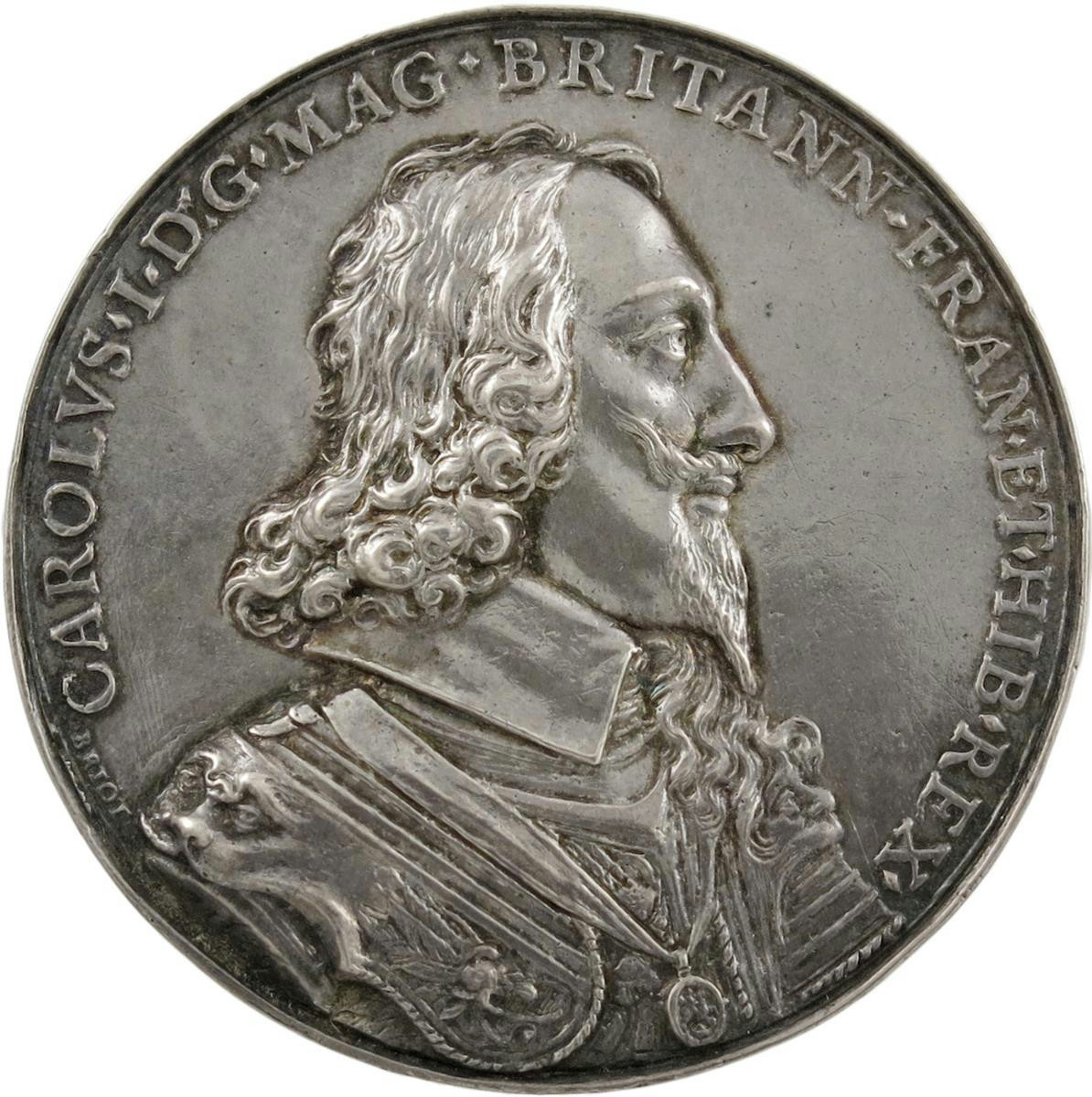 Charles I, the Dominion of the Sea, cast silver medal, undated [1639], by Nicolas Briot, bust right, wearing plain collar over armour with lion's head shoulder plate, Garter George suspended from ribbon, signed behind shoulder BRIOT, CAROLVS I DG MAG BRITANN FRAN ET HIB REX, rev., ship sailing right, NEC META MIHI QVÆ TERMINVS ORBE, 60mm (MI 285/97; BHM [Jones] 174; Eim. 136; MH 29; Farquhar I, 203; Platt, pp. 147-48). A choice example of a wonderful portrait medal, extremely fine, toned and rare.