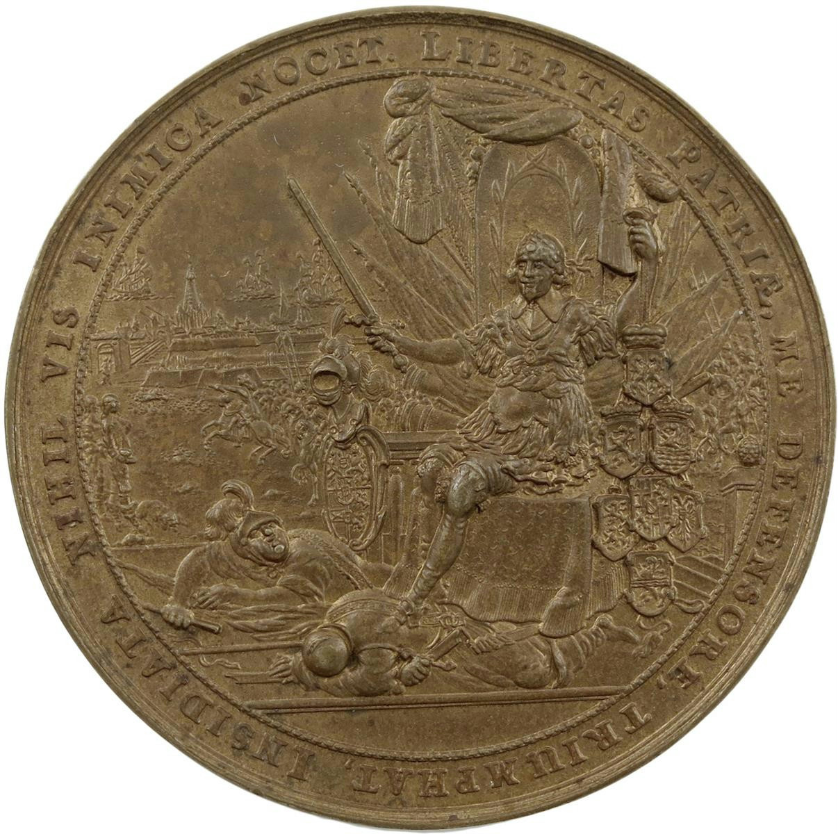 Mary, Princess Royal (1631-1660), her arrival in Holland, copper medal, 1642, by Sebastian Dadler, Frederick Henry, Prince of Orange, seated on throne, trophies and shields around, his foes at his feet, LIBERTAS PATRIÆ ME DEFENSORE TRIUMPHAT …, rev., Prince William and Princess Mary meet within a fenced garden with central Belgic lion, יְהֹוָה radiating from clouds above, QUO TE MARS ET AMOR…, 72mm (MI 290/105; vL II, 257; Eim. 138; Wiecek 107). Traces of having been gilt, nearly extremely fine.