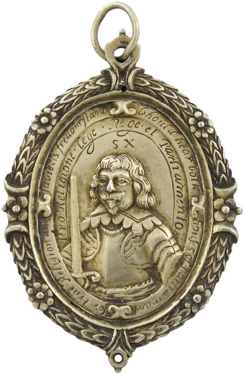 Robert Devereaux, 3rd Earl of Essex (1591-1646), Captain-General and Commander-in-Chief of the Parliamentary army, oval gilt-silver Military Reward badge, 1642, by Thomas Rawlins, half length armoured bust three-quarters left, wide lace collar, holding sword, SX above head, legend in script in two lines, "Should hear both houses of parliament for true religion and subjects freedom stand - Pro Religione lege Rege et Parliamento", rev., the two Houses of Parliament with King and Speaker, wreath border around to both sides, 55.5 x 38mm (MI 295/113; Eim. 140A; Platt II, pp. 79-80), integral suspension loop and ring. Extremely fine and rare.