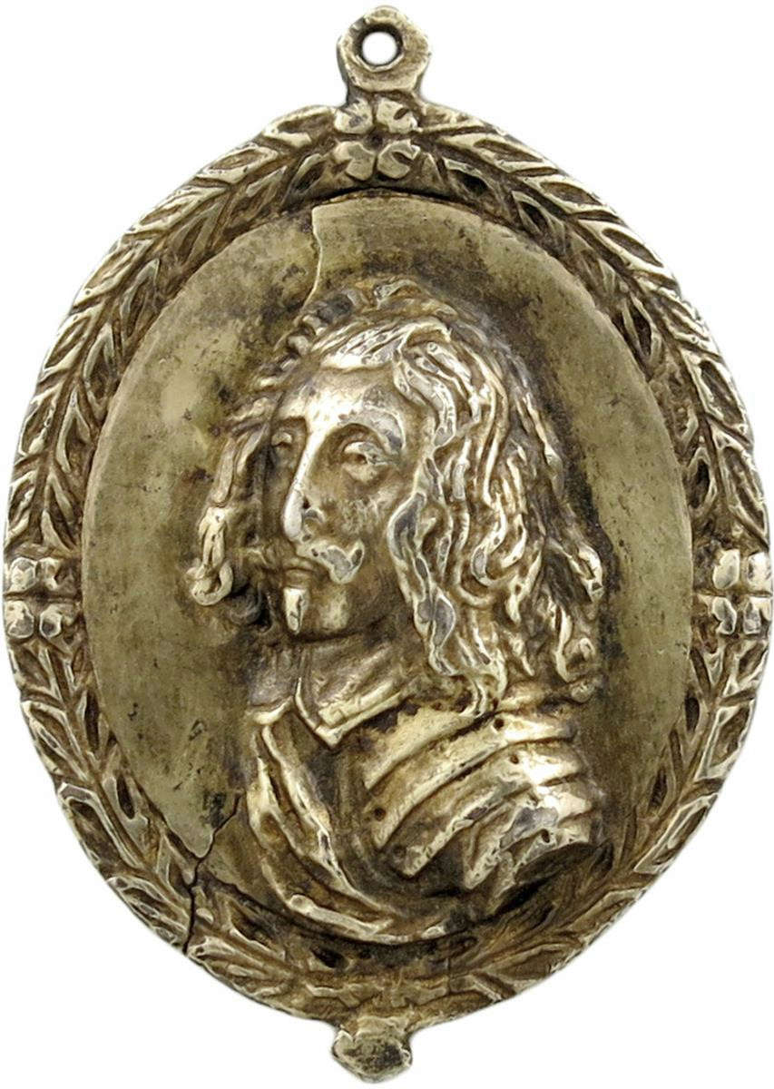 Edward Montagu, Lord Mandeville and 2nd Earl of Manchester (1602-1671), commander of the Parliamentary Eastern Association army, small oval gilt-silver Military Reward, 1643, by Thomas Rawlins (?), armoured bust three-quarters left, sash over shoulder, his hair long, rev., arms of Montagu in oval garnished shield, Earl's coronet above, leaf or wreathed border to both sides, 33 x 24mm (MI 309/137; Eim. 143A; Platt II, pp. 231-32; Vertue XV, D), integral suspension loop. Good very fine and rare, though flan with slight split at 7 o'clock, from edge to lower bust.