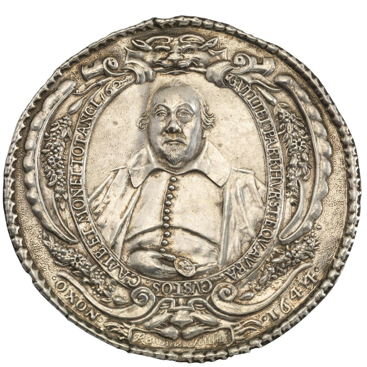 Sir William Parkhurst (d. 1667), a large silver cliché medallion, 1644, by Thomas Rawlins, half-length bust within oval frame, full-face, wearing cloak over buttoned doublet and holding an oval badge of Charles I in his right hand, GVILIEL PARKHVRST EQV AVRA CVSTOS CAMB ET MONET TOT ANGL 1623, and below OXON - 1644, signed "T. Rawlins Sculps", garnished and floral border around with lion mask at top, outer raised leaf border, 77mm (MI 311/140; Eim. -; Platt II, pp. 248-49), contained in a shallow circular lignum vitae box with geometric turned lid. A medal of considerable numismatic importance, a slight crease to left of head, good very fine and excessively rare.