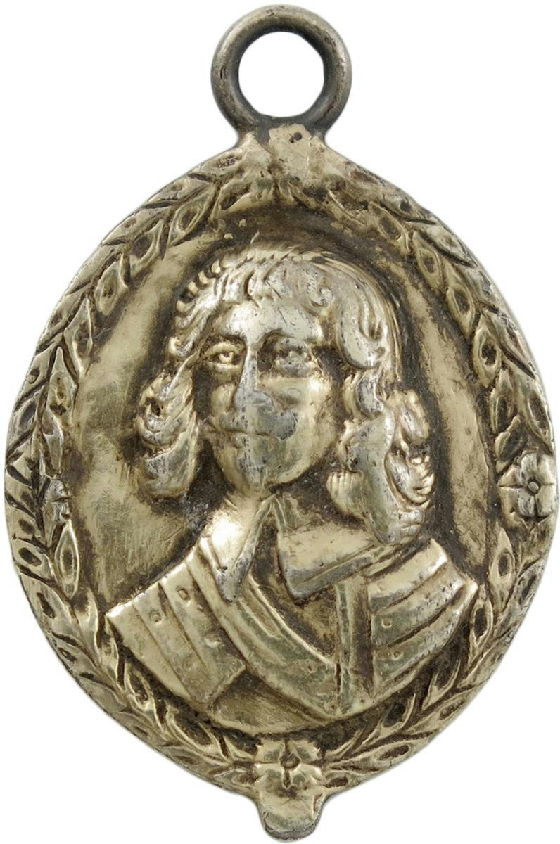 General Sir Thomas Fairfax (1612-1671), 3rd Lord Fairfax, gilt-silver Military Reward, 1645, an oval badge, armoured bust three-quarters left, plain collar, leaf border both sides, raised on obverse, rev., armorial shield of Fairfax, Sr THO FAIRFAX Knt FOR KING & PARLmt, 36 x 23.5mm (MI 317/149; Platt II, type C, p. 103). Very fine.
