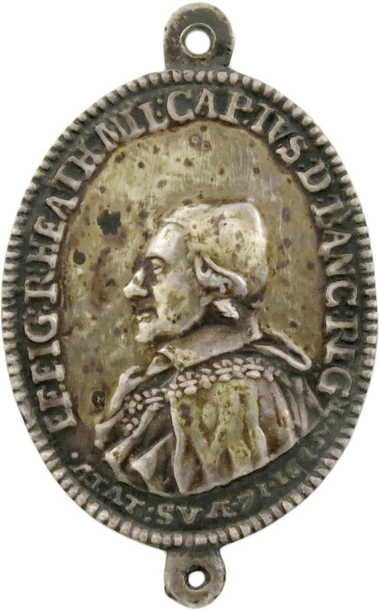 Sir Robert Heath (1575-1649), judge, politician, Attorney General and Lord Chief Justice, silver badge, 1645, by Thomas Rawlins, signed R on obverse, bust left in robes of office, Collar and wearing cap, EFFIG R HEATH MIL CAP IVS D BANC REG - ÆTAT SVÆ 71 1645, rev., armorial shield of Heath in incuse, within laurel branches, 40.5 x 25mm (MI 319/154; Platt II, pp. 150-51), integral suspension loop and loop also at bottom. Good very fine, seemingly once gilt and uneven tone, very rare.