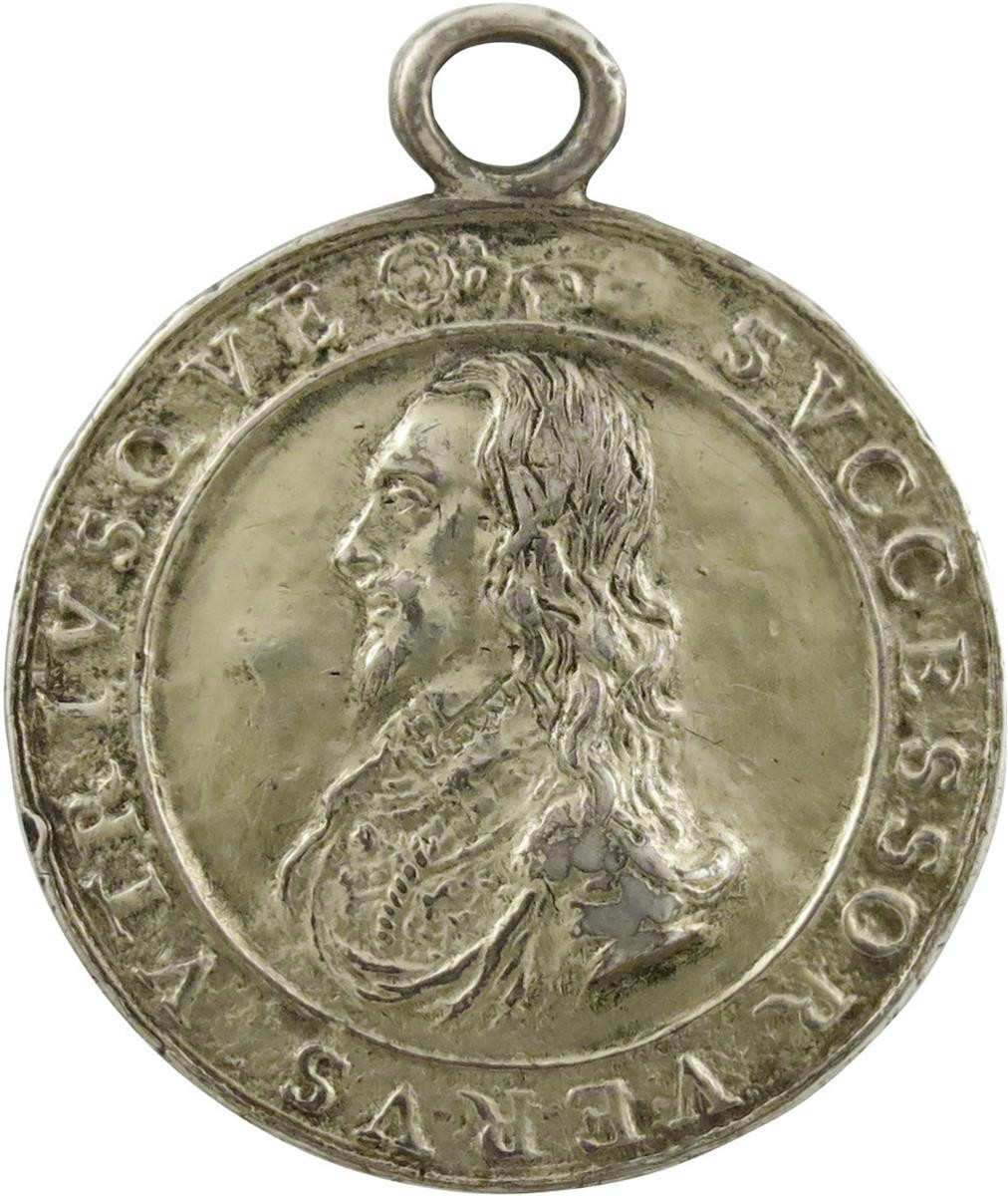 Charles I, Death and Memorial, cast gilt-silver medal, 1649, by Thomas Rawlins], bust left, hair long, in falling collar and decorated armour, two roses above, plain in field, SVCCESSOR VERVS VTRISQVE, rev., a hammer striking a diamond placed on an anvil, INEXPVGNABILIS, 42.5mm, (MI 340/187; cf Eim. 157; Platt I, type A, pp. 244-45), with integral ring for suspension. Very fine with original gilding, an extremely rare variety.