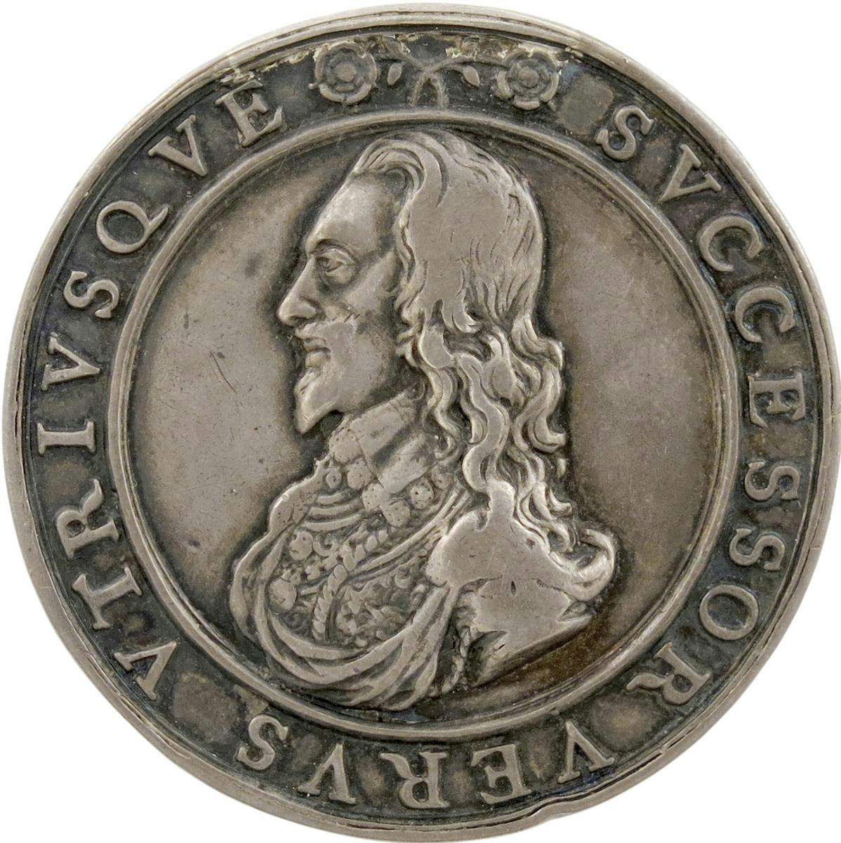 Charles I, Death and Memorial, cast silver medal, 1649, by Thomas Rawlins, bust left, hair long, in falling collar and decorated armour, two roses above, plain in field, SVCCESSOR VERVS VTRISQVE, rev., a salamander amid flames, CONSTANTIA CAESARIS IAN 30 1648, 42mm (MI 341/188; Eim. 157; Platt I, type B, pp. 244-45; Farquhar p. 270). Good very fine with deep tone, rare.