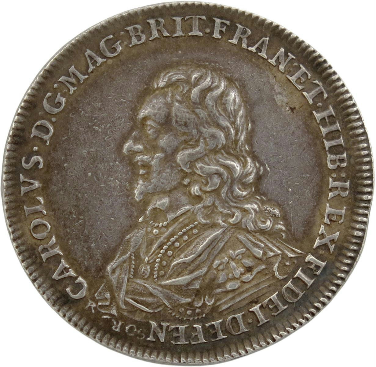 Charles I, Death and Memorial, silver medal, 1649, by Thomas Rawlins, bust left, hair long, wearing armour with lion shoulder-plate, mantle tied at shoulder, and Garter George on ribbon, CAROLVS DG MAG BRIT FRAN ET HIB REX FIDEI DEFENSOR, rev., a rock buffeted by the winds and waves, IMMOTA TRIVMPHANS - IAN 30 1648, 42mm (MI 341/190; Eim. 158; Platt type D, p. 247; vL II, 321). Extremely fine with dark tone, scarce.
