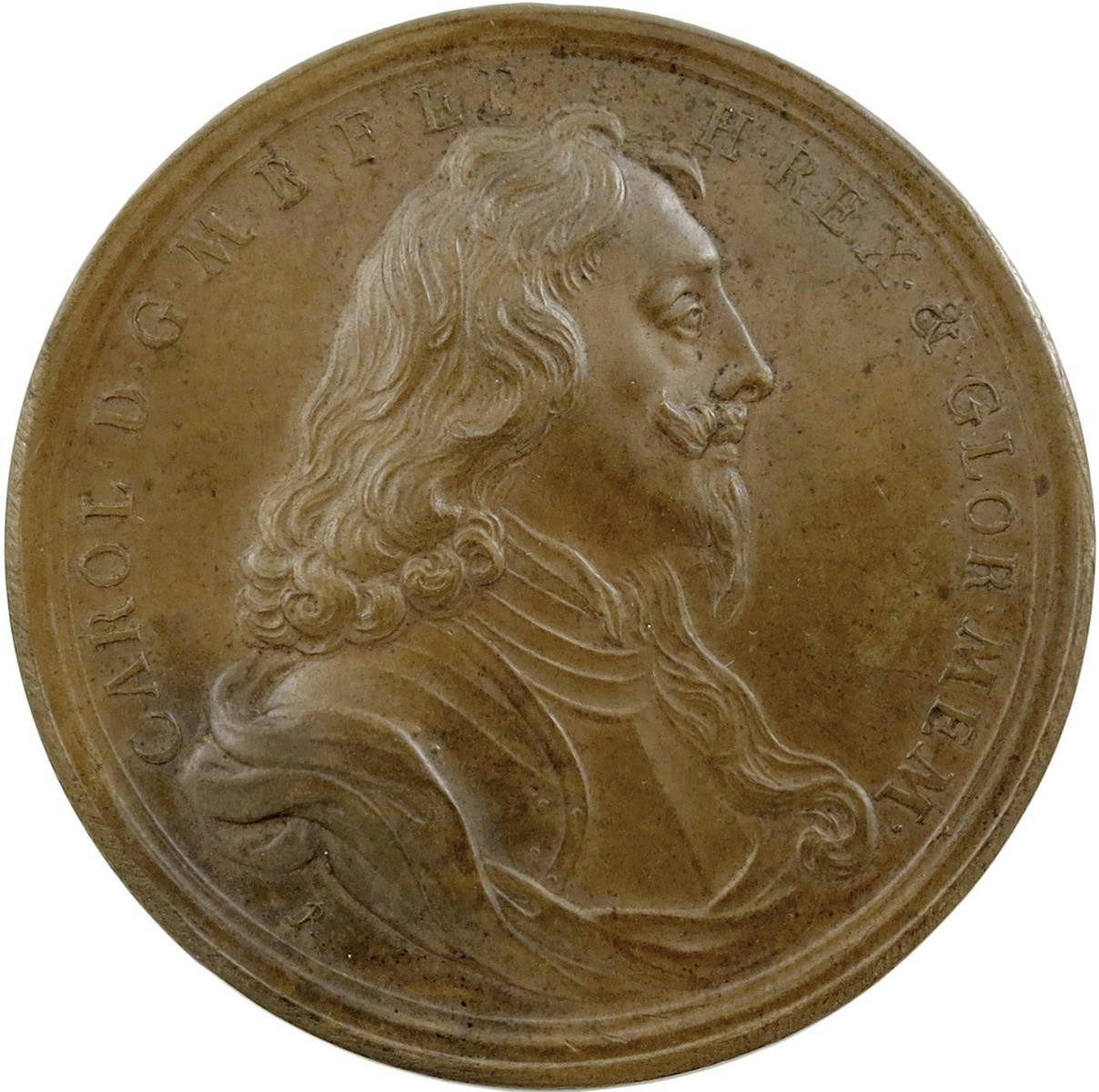 Charles I, copper Memorial medal, 1649, by James and Norbert Roettier, struck after the Restoration, bust right wearing armour, hair long and love-lock falling over left shoulder, CAROL DG MB F ET H REX & GLOR MEM, rev., hand from heaven holds crown over pastoral landscape, VIRTVT EX ME FORTVNAM EX ALIJS, 51mm (MI 346/200; Eim. 162a; Platt I, type B, p. 262; Weiss, Fig. 1). Extremely fine, a little mottled toning to reverse.
