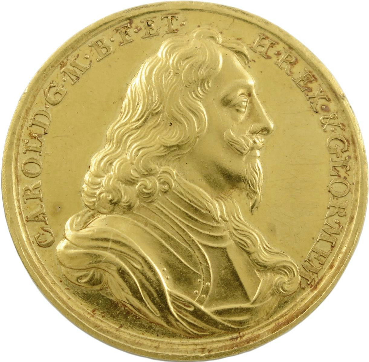 Charles I, gold Memorial medal, 1649, by James and Norbert Roettier, armored and draped bust right, CAROL DG M B F ET H REX & GLOR MEM, rev., hand from heaven holds crown over a pastoral landscape, VIRTVT EX ME FORTVNAM EX ALIJS, 34.5mm 16.7 mm (MI 347/201; Platt I, type C, p. 263; Eim. 162b). Extremely fine and excessively rare in gold.