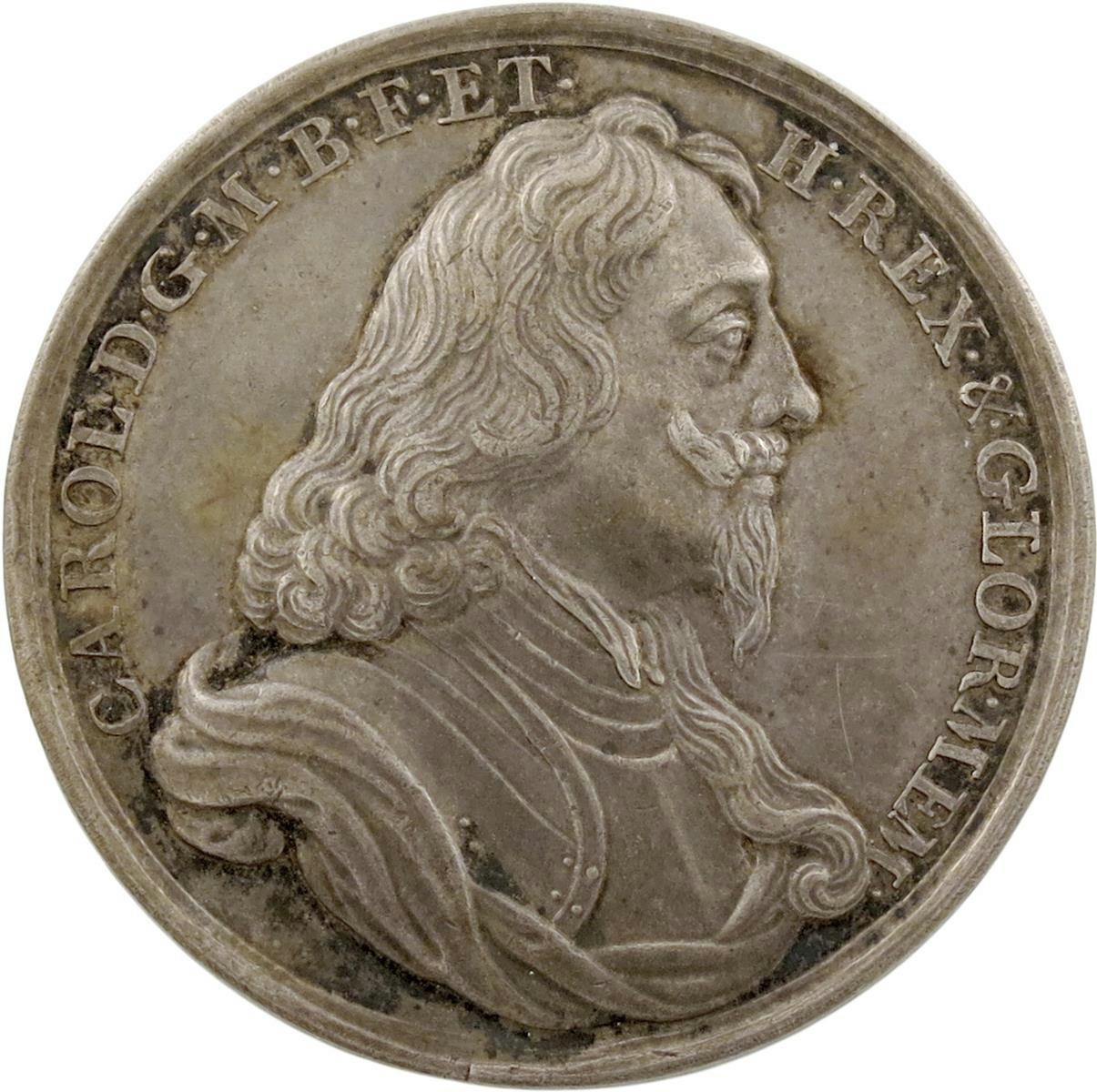 Charles I, silver Memorial medal, 1649, by James and Norbert Roettier, armored and draped bust right, CAROL DG M B F ET H REX & GLOR MEM, rev., hand from heaven holds crown over a pastoral landscape, VIRTVT EX ME FORTVNAM EX ALIJS, 34.5mm 16.7 mm (MI 347/201; Platt I, type C, p. 263; Eim. 162b). Extremely fine and toned.