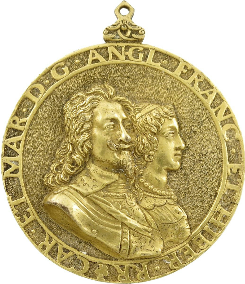 Charles I, a uniface gilt-bronze Memorial medal, 1649, by Hans Reinhardt the younger, a variation on the previous medal, conjoined busts right of Charles and Henrietta Maria, he, in armour slightly turned, hair falling over plain lace collar, wearing Garter George on ribbon, she with pearl necklace, CAR ET MAR DG ANGL FRANC ET HIBER RR, the design and legend against a stippled background, 73mm (cf MI 350/209; Eim. 159, cf Platt p. 259), with ornate integral suspension loop. A second superb medal, extremely fine.