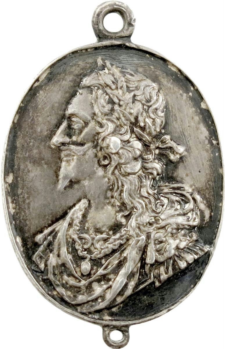 Charles I and Henrietta Maria, silver Royalist Badge, by Thomas Rawlins, laureate and armoured bust of Charles left, with lion shoulder-plate and Garter George on chain, rev., bust of Henrietta left, her hair tied back and curled at sides, wearing pearl necklace, 33 x 21mm (MI 355/218; pl. XXXI, 9; Eim. 170b; Platt I, type A, p. 192; Farquhar I, 211). Extremely fine, cast and lightly