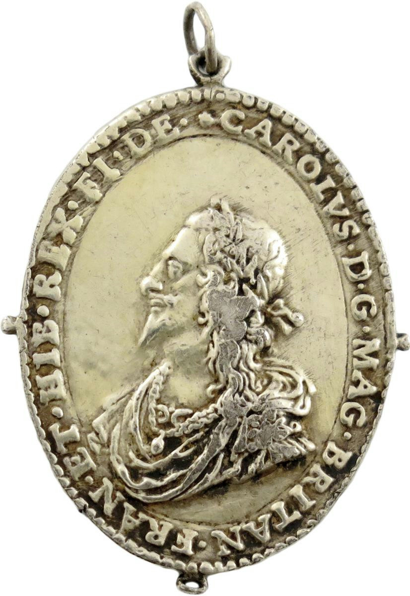Charles I and Henrietta Maria, gilt-silver Royalist Badge, by Thomas Rawlins, laureate and armoured bust of Charles left, with lion shoulder-plate and Garter George on chain, CAROLVS DG MAG BRITAN FRAN ET HIB REX FI DE, rev., bust of Henrietta left, her hair tied back and curled at sides, wearing pearl necklace, signed below, HENRETTA MARIA DG MAG BRITAN FRAN ET HIB REG, 42 x 31mm (cf MI 355/218 for obverse; MI 354/216 for reverse), integral suspension loop and ring. Very fine, lightly chased the gilding light and contemporary and a seemingly unpublished variety.