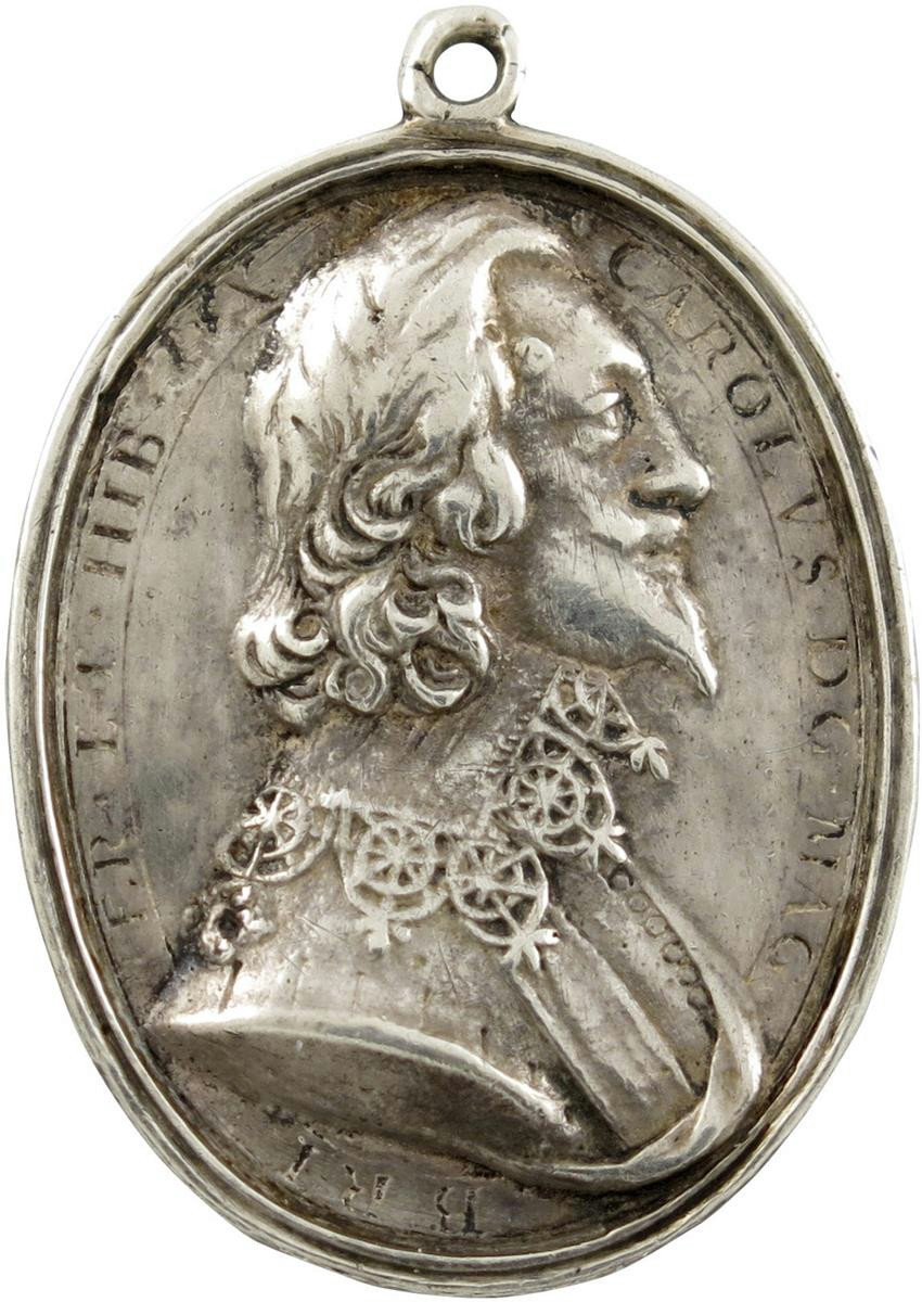 Charles I, silver Royalist Badge, by Thomas Rawlins, bust of Charles I right with falling lace collar and close buttoned doublet, CAROLVS DG MAG BRI FR ET HIB RX, rev., in imitation of engraving, crowned shield of Royal arms, Garter around, plain rim, 28 x 37mm (MI 360/231; Eimer 167; Platt I, pp. 167-171), integral suspension loop. Very fine or nearly so.