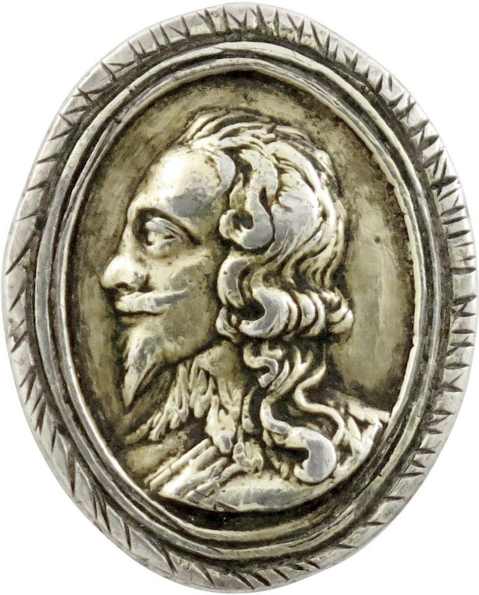 Charles I, small gilt-silver Royalist badge, by Thomas Rawlins, bust of Charles I left, hair long, falling lace collar, rev., in incuse, crowned shield of arms within Garter, 21 x 17mm (MI 361/235; Platt I, p. 289, type I). Good very fine but lacks suspension loop.