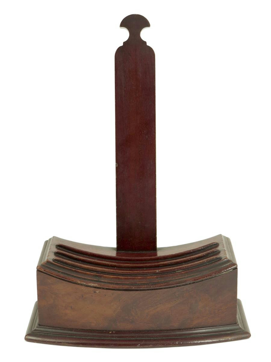 A late Regency mahogany plate stand, the dipped top with three rests, 31.5cm high, 23cm wide, 11.3cm deep.