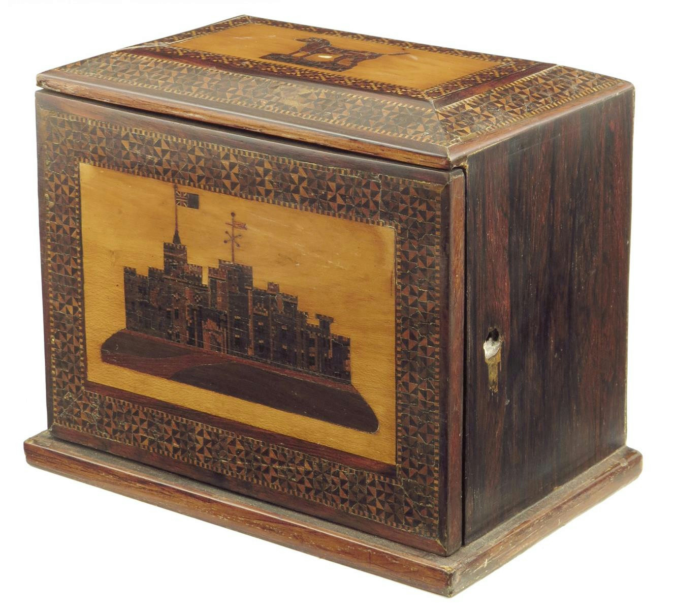 λ A Victorian Tunbridge ware and rosewood table cabinet, inlaid with parquetry bands, the top with a panel of a dog above a hinged door inlaid with a view of Eridge Castle, enclosing four graduated drawers with turned ebonised handles, 14.5cm high, 18.4cm wide, 11.6cm deep.