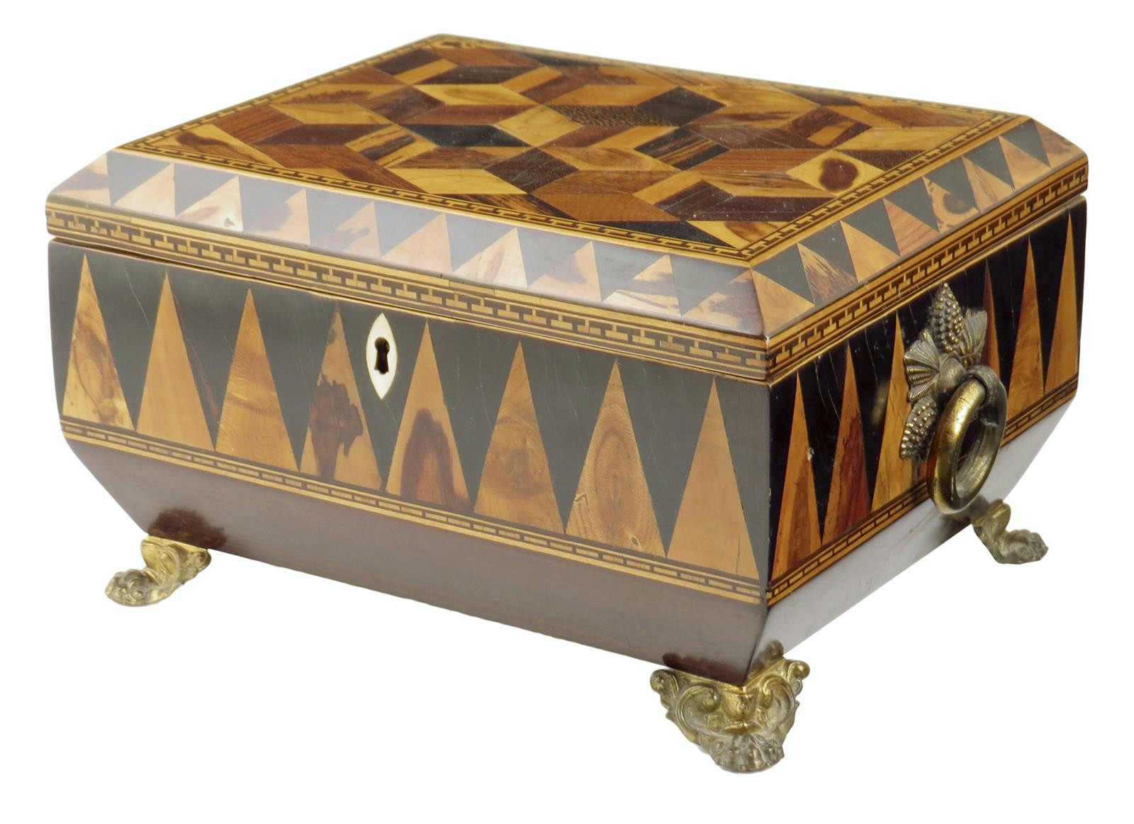 A Regency Tunbridge ware specimen wood work box, of sarcophagus shape, the hinged lid inlaid a parquetry cube panel with an outer band of Vandykes with a conforming body, the paper lined vacant interior to gilt brass ring handles with leaf plates and on cast scroll and leaf feet, 15.8cm high, 29cm wide, 21.7cm deep.