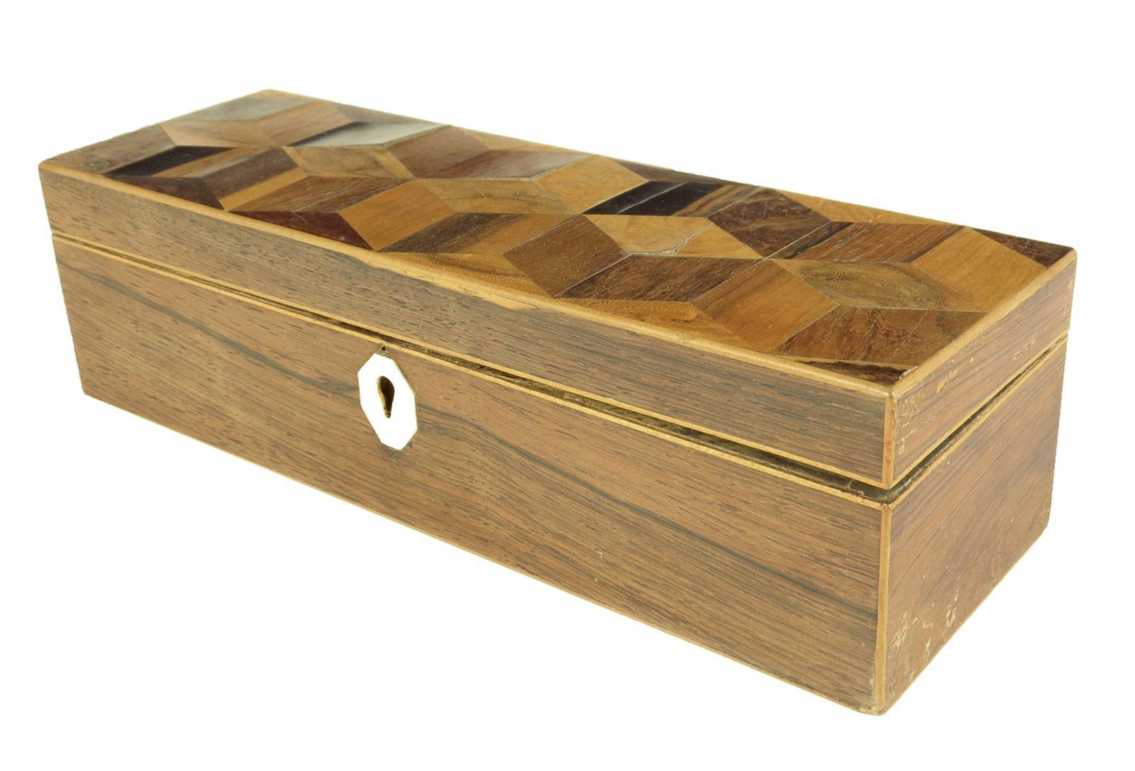 A Victorian Tunbridge ware and rosewood rectangular box, with a specimen wood parquetry cube lid, with a later mother of pearl escutcheon, 6.5cm high, 24.2cm wide, 7.8cm deep.